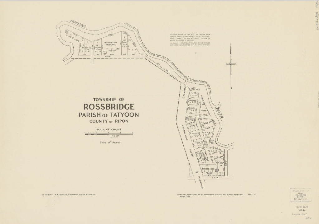 The town of Rossbridge was established on the Ararat to coast Road during the 1860s. It was named after Ross’s Bridge at the crossing of the Hopkins River. The bridge was named after John Ross, the selector of the Mount William Plains 20,000-acre pastoral run.