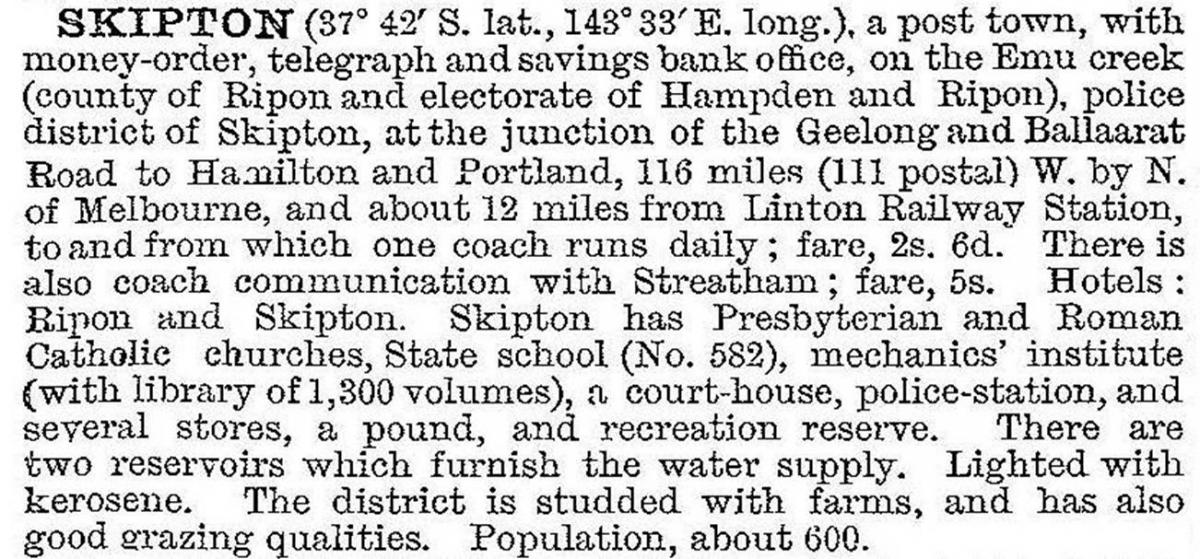 In 1838 a pastoral run was established in the Skipton area. A hut was built beside Mount Emu Creek which became the site of the township of Skipton which was surveyed in 1852. It is believed that Skipton was named after Skipton in Yorkshire in England. The old English Scip-tun means sheep town. In 1858 the Skipton Hotel was built.