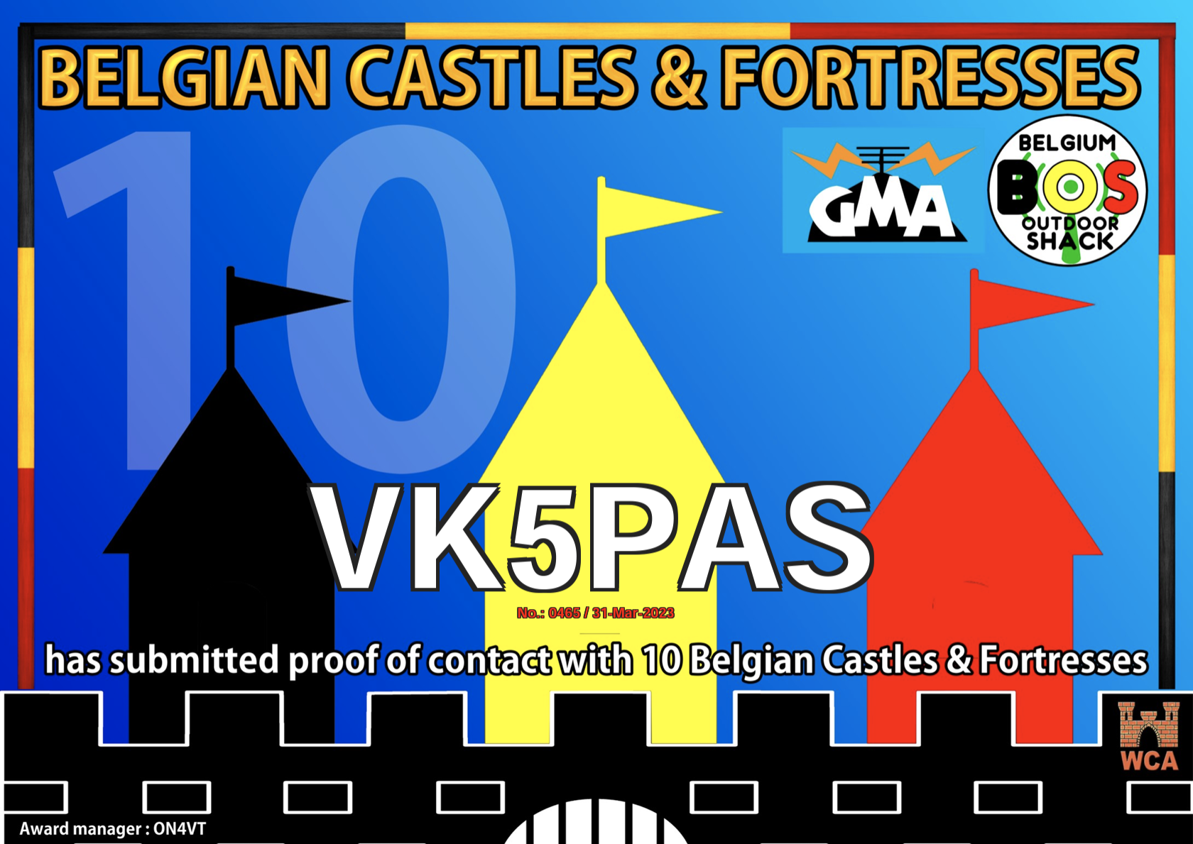 Here are some certificates I have received for the Belgium Castles & Fortresses Award.