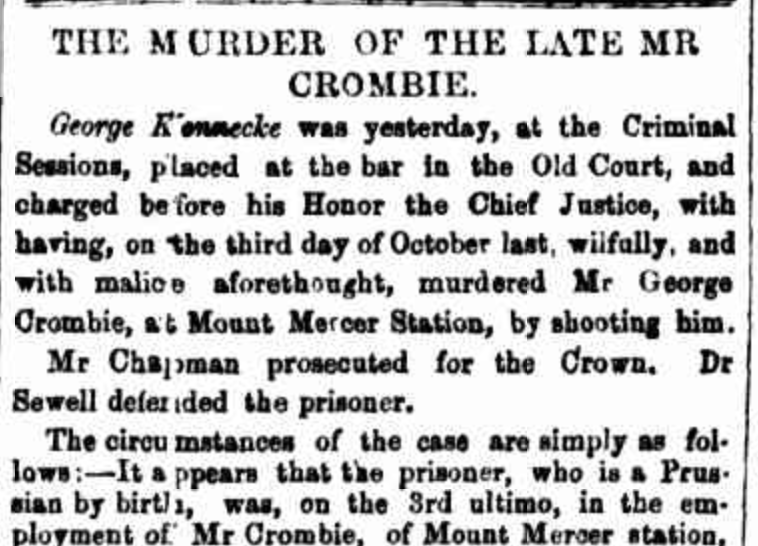 In 1859, the Mount Mercer Station was the scene of a murder. George Kennecke was charged with the shooting murder of George Crombie.