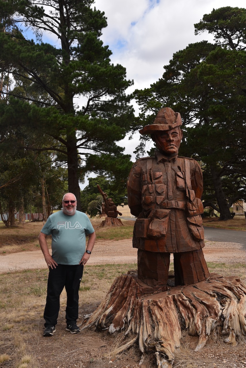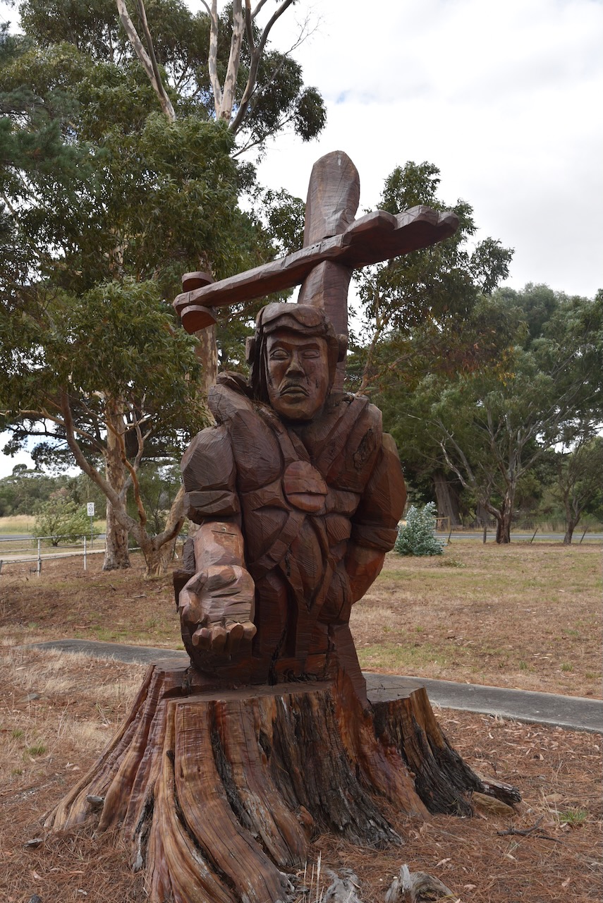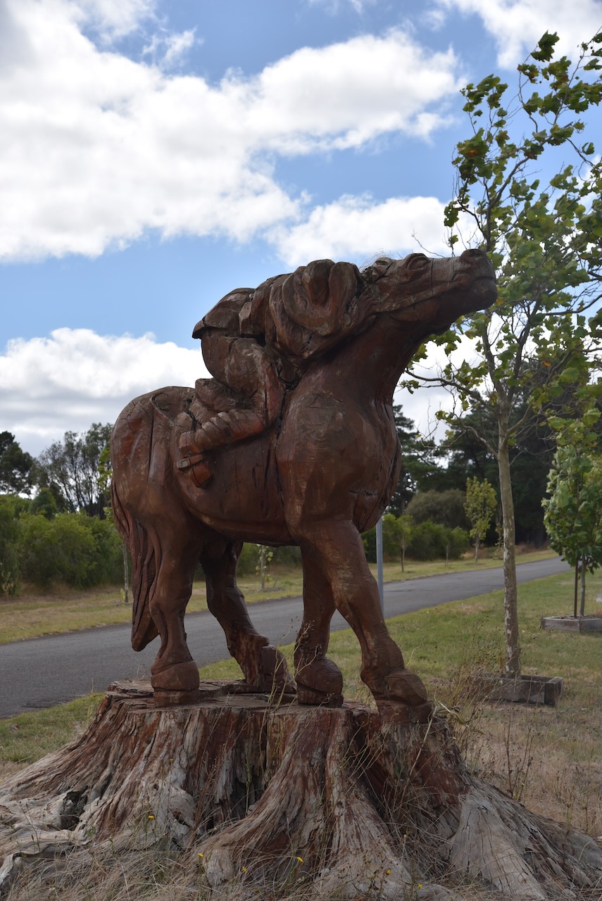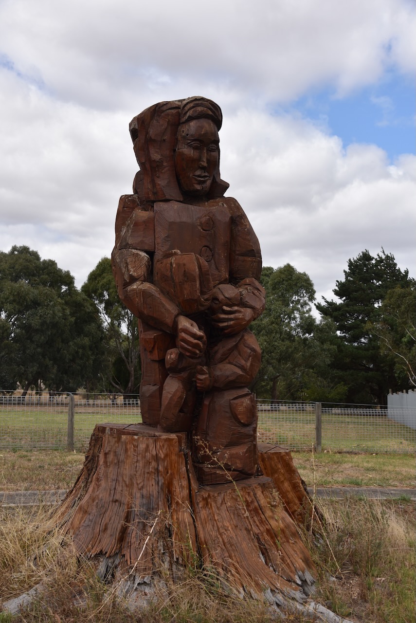 Cordinhap’s Avenue of Honour commemorates those who served in World War One. The Avenue contains a number of wood carvings that depict a wounded officer and horse, a digger, a pilot of a Lancaster bomber, and a woman and child. The carvings were made from Cypress and Radiata pine trees on the avenue which had started to die. Rather than cut the trees down, the lower trunks were kept and local artist Viktor Cebergs transformed the tree stumps into works of art.