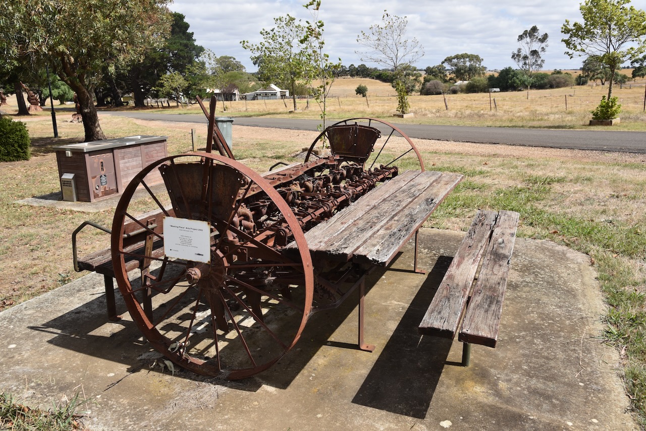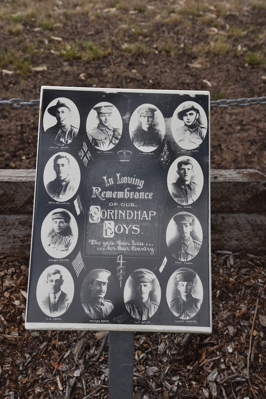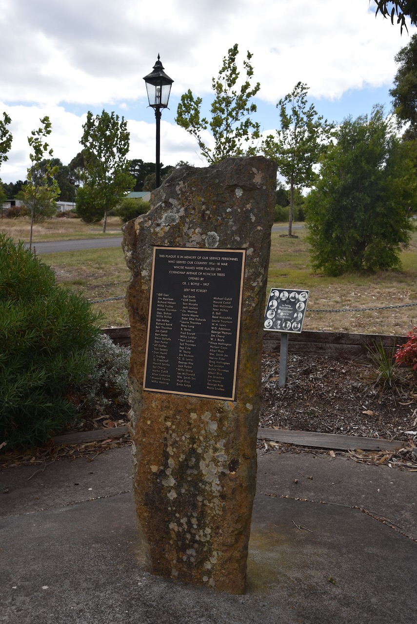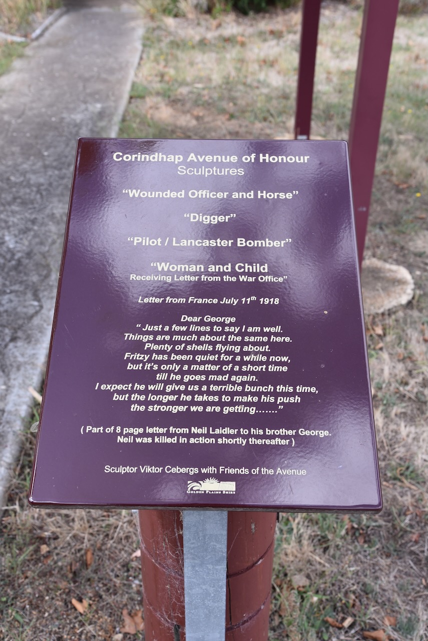 Cordinhap’s Avenue of Honour commemorates those who served in World War One. The Avenue contains a number of wood carvings that depict a wounded officer and horse, a digger, a pilot of a Lancaster bomber, and a woman and child. The carvings were made from Cypress and Radiata pine trees on the avenue which had started to die. Rather than cut the trees down, the lower trunks were kept and local artist Viktor Cebergs transformed the tree stumps into works of art.