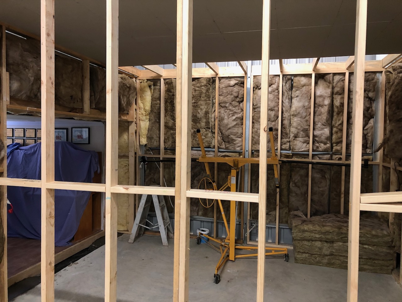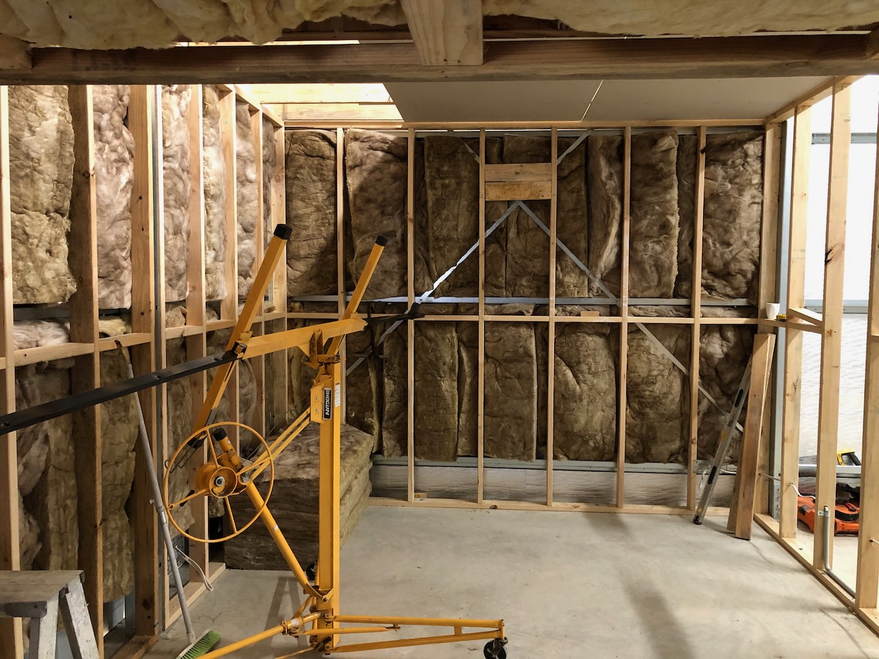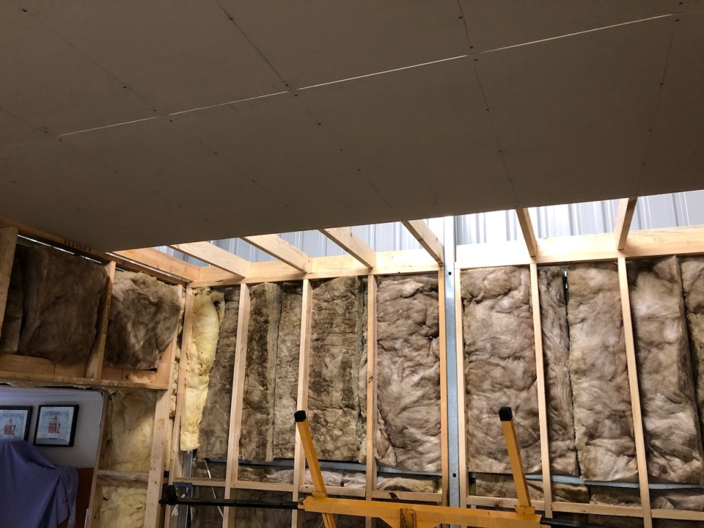 The electrician has been to install the wiring. The insulation has been added, and two ceiling panels have been installed.