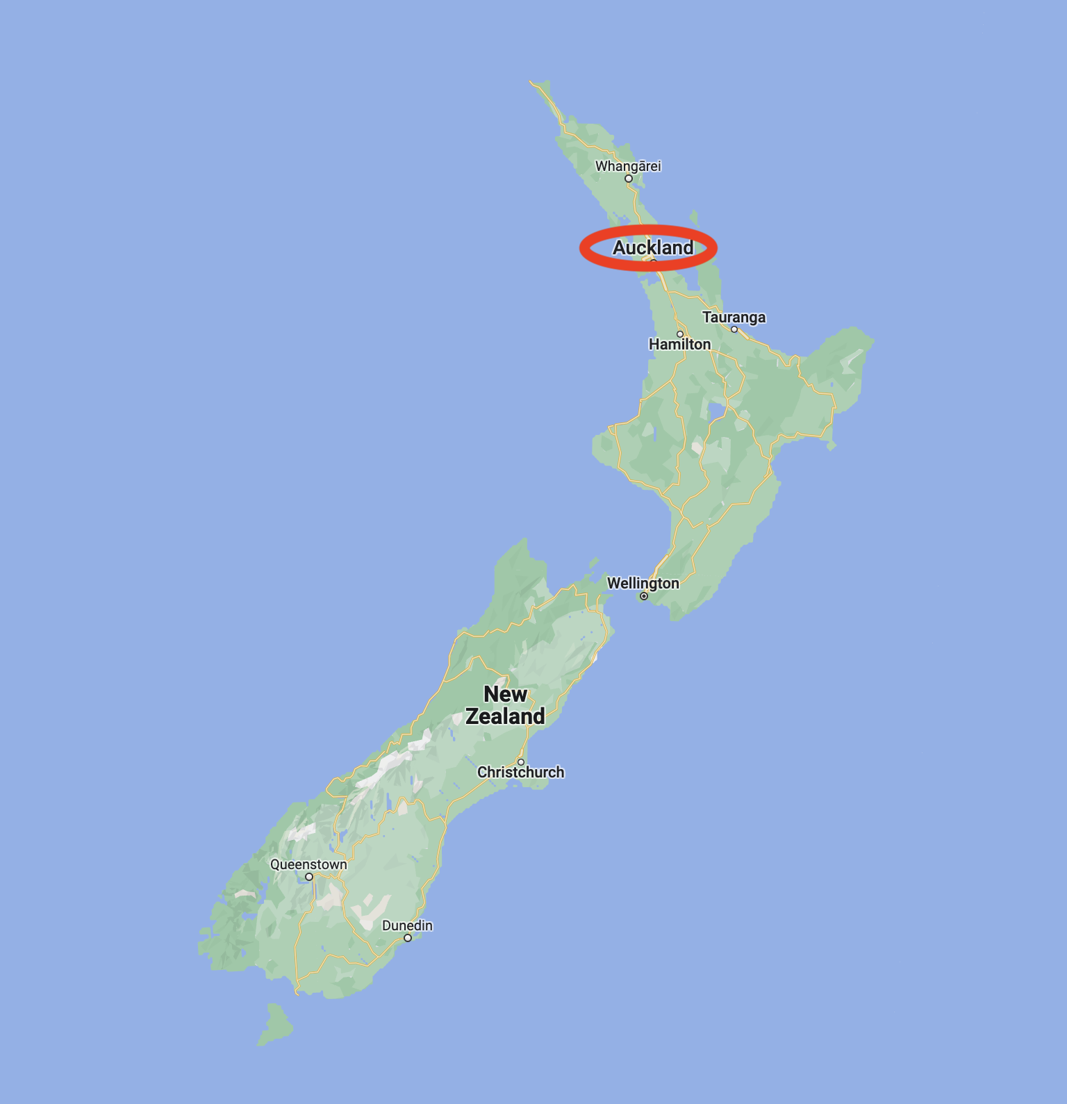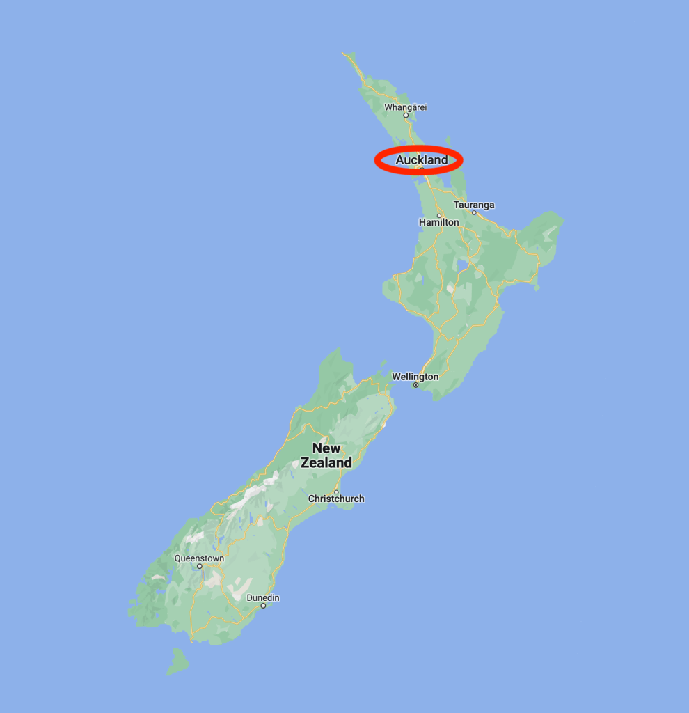 Above:- Map showing the location of Auckland in New Zealand. Map c/o Google Maps.