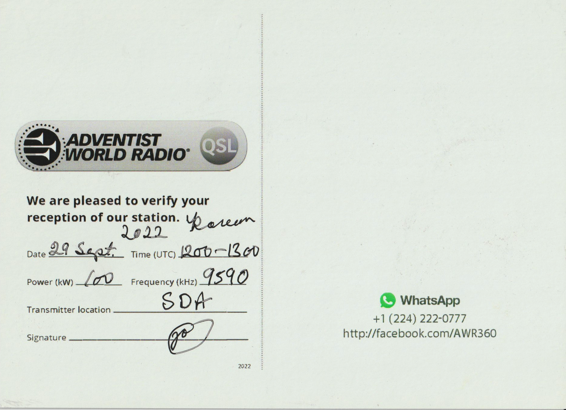The second is for the reception of KSDA on 29th September 2022, on 9590 kHz.
