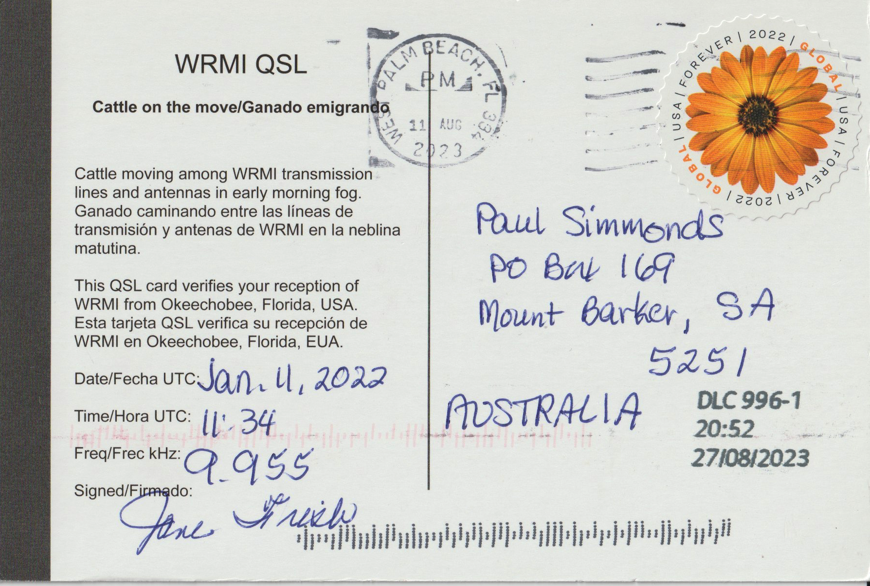 A few days ago in the mail, I received a QSL card from WRMI USA, for my reception of their station on 9955 kHz on 11th January 2022.