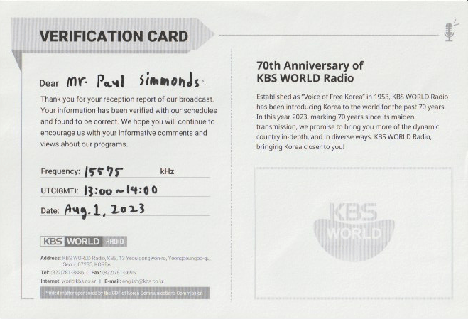 The overall reception was fair. The Voice of Korea was broadcasting on the same frequency in the English language and this caused moderate interference and affected listening pleasure.