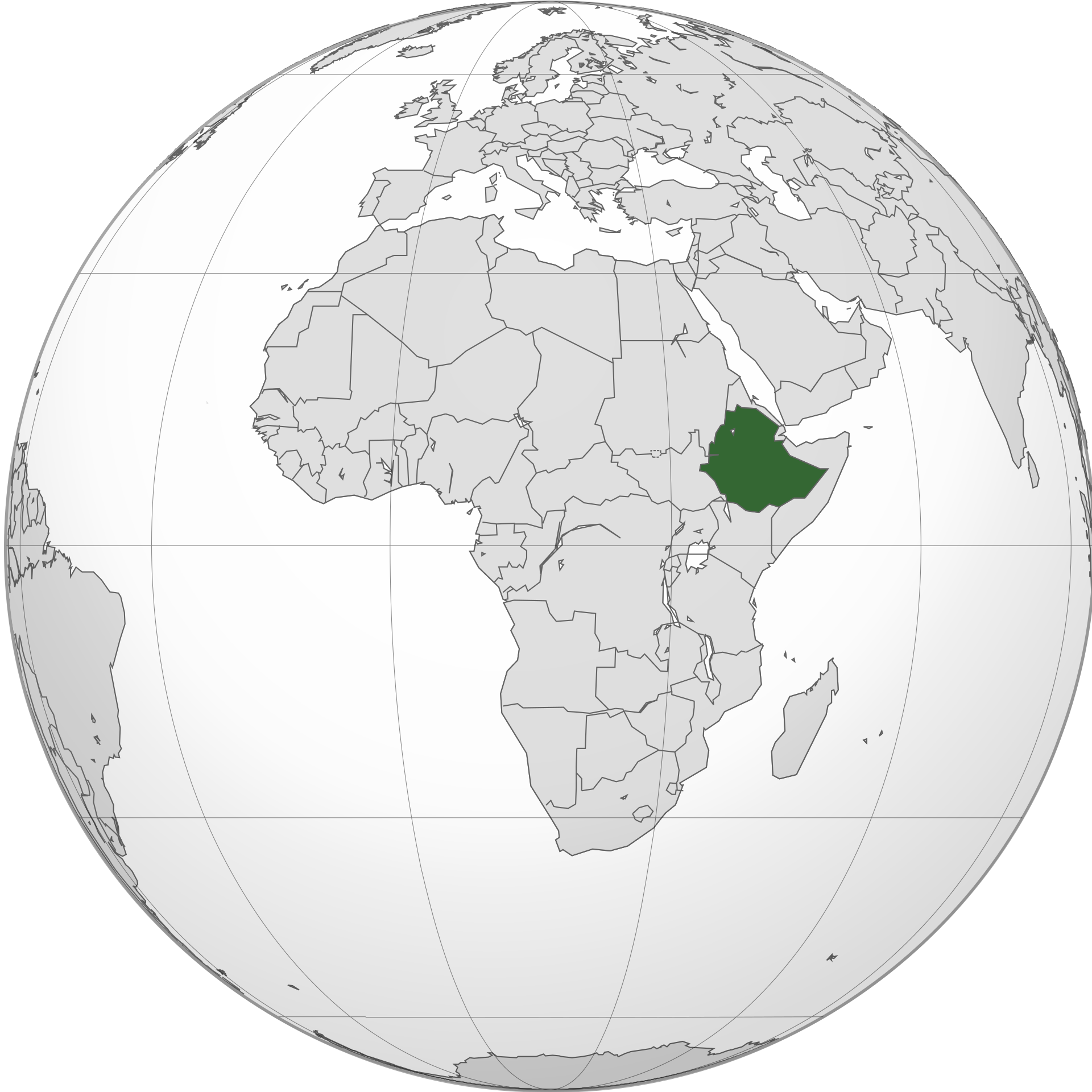 Above:- World globe showing the location of Ethiopia in Africa. Image c/o Wikipedia.