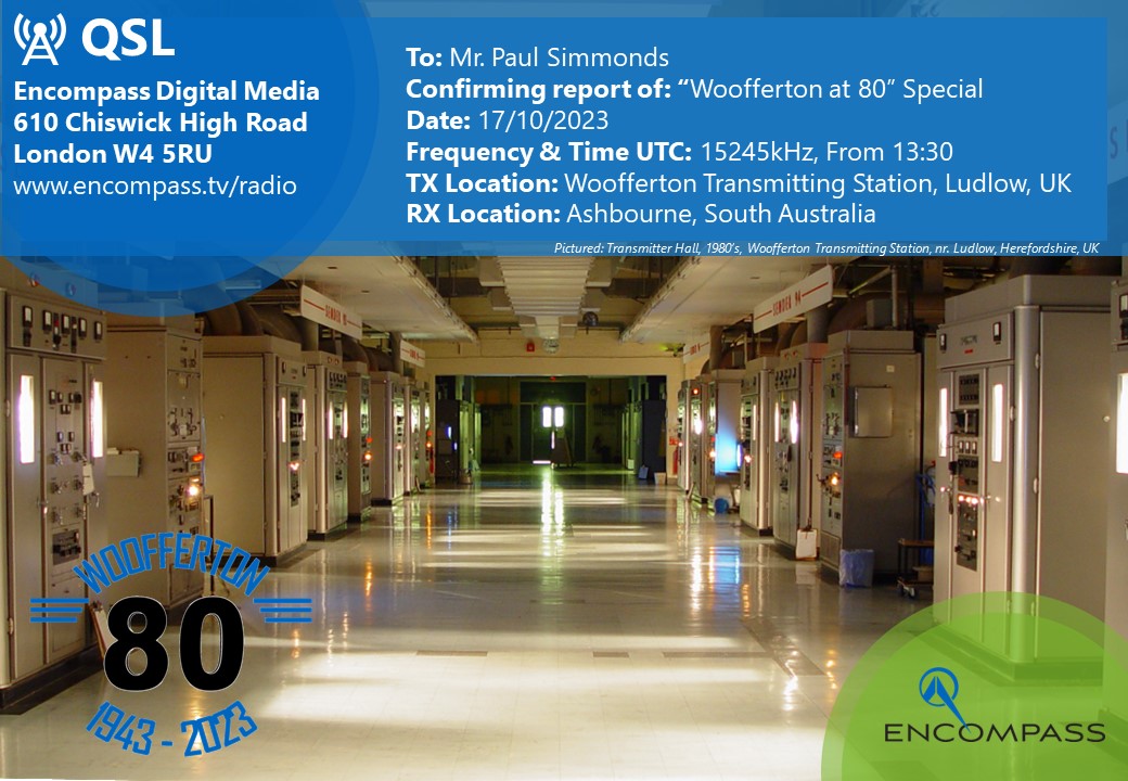 At about 1330 UTC on 17th October 2023, I tuned in to a special 80-year anniversary broadcast from Encompass Media at the Woofferton Transmitting Station UK, broadcasting in the English language on 15245 kHz.
