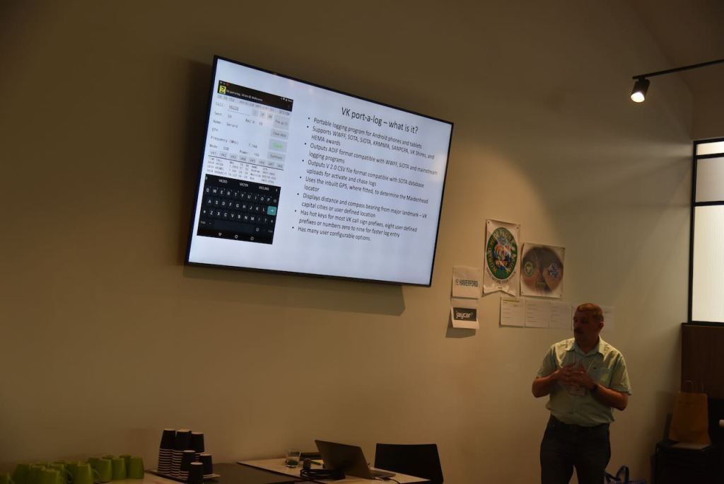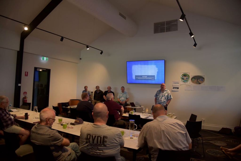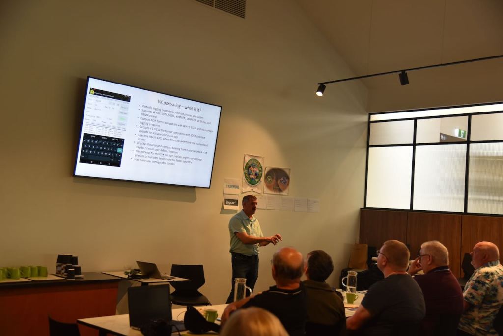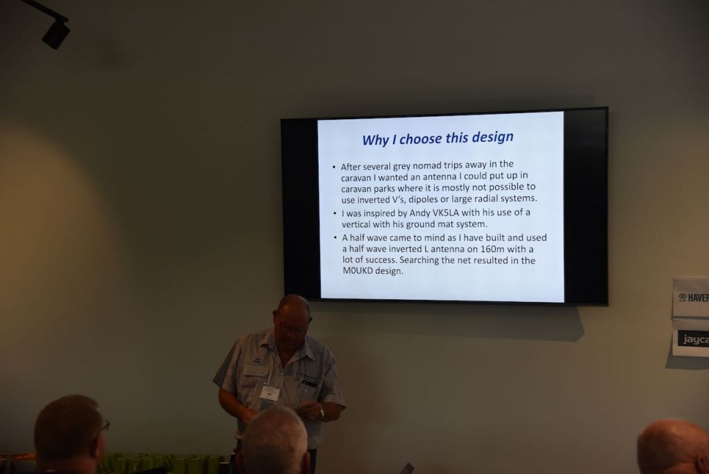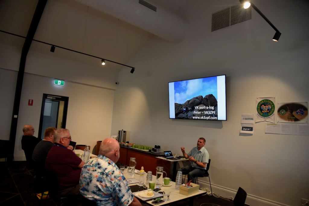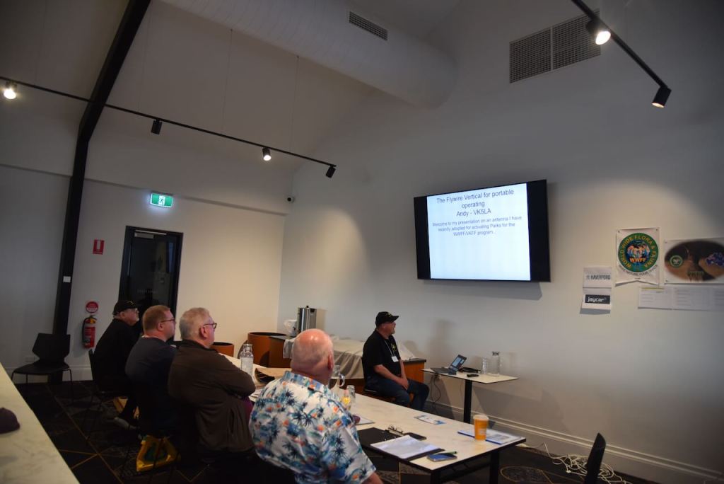 On Saturday there was a series of presentations in the Nanya Function Room at the Hotel Renmark. This included everything from an introduction to VKFF, a fly wire vertical antenna, VK-port-a-log, a home brew half wave antenna matching unit, and snake bite procedures.