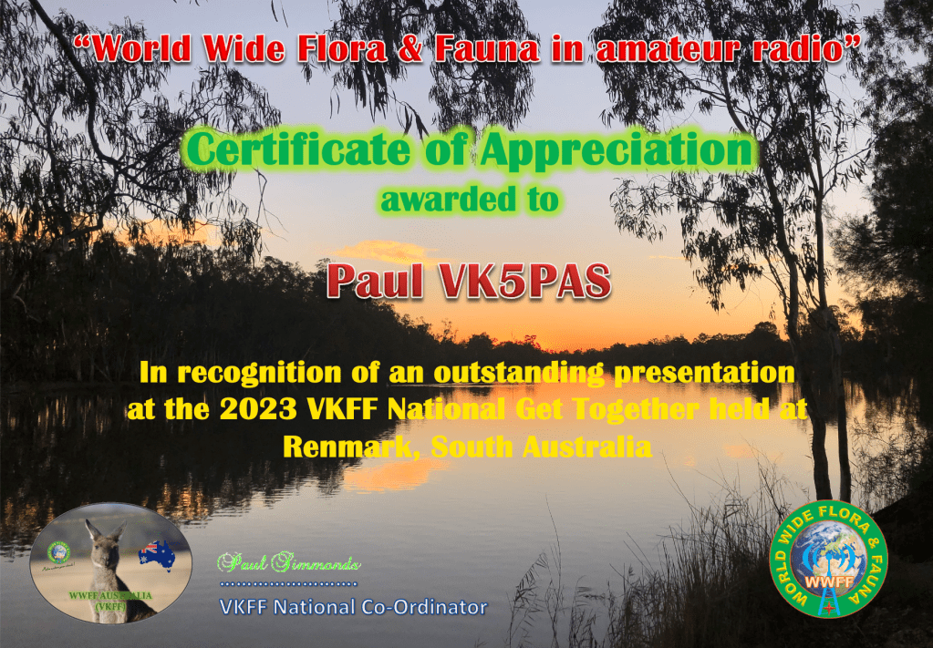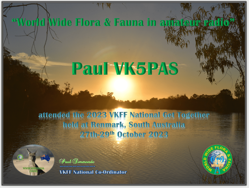 The 2023 VKFF National Get-Together was held on Friday 27th October, Saturday 28th, and Sunday 29th October 2023. It was held at Renmark, South Australia.