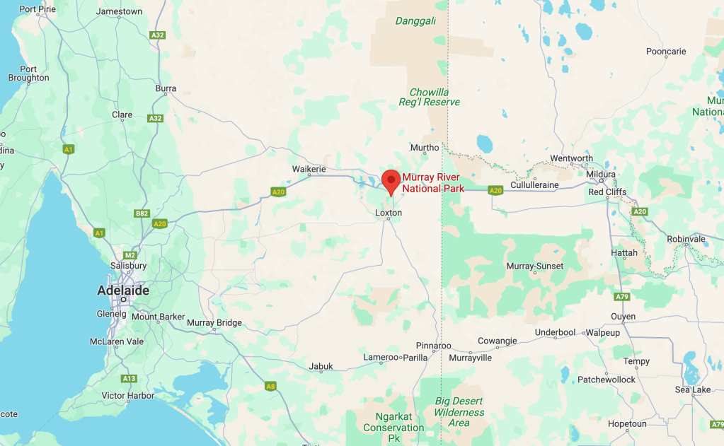 Above:- Map showing the location of the Murray River National Park. Map c/p Google Maps.