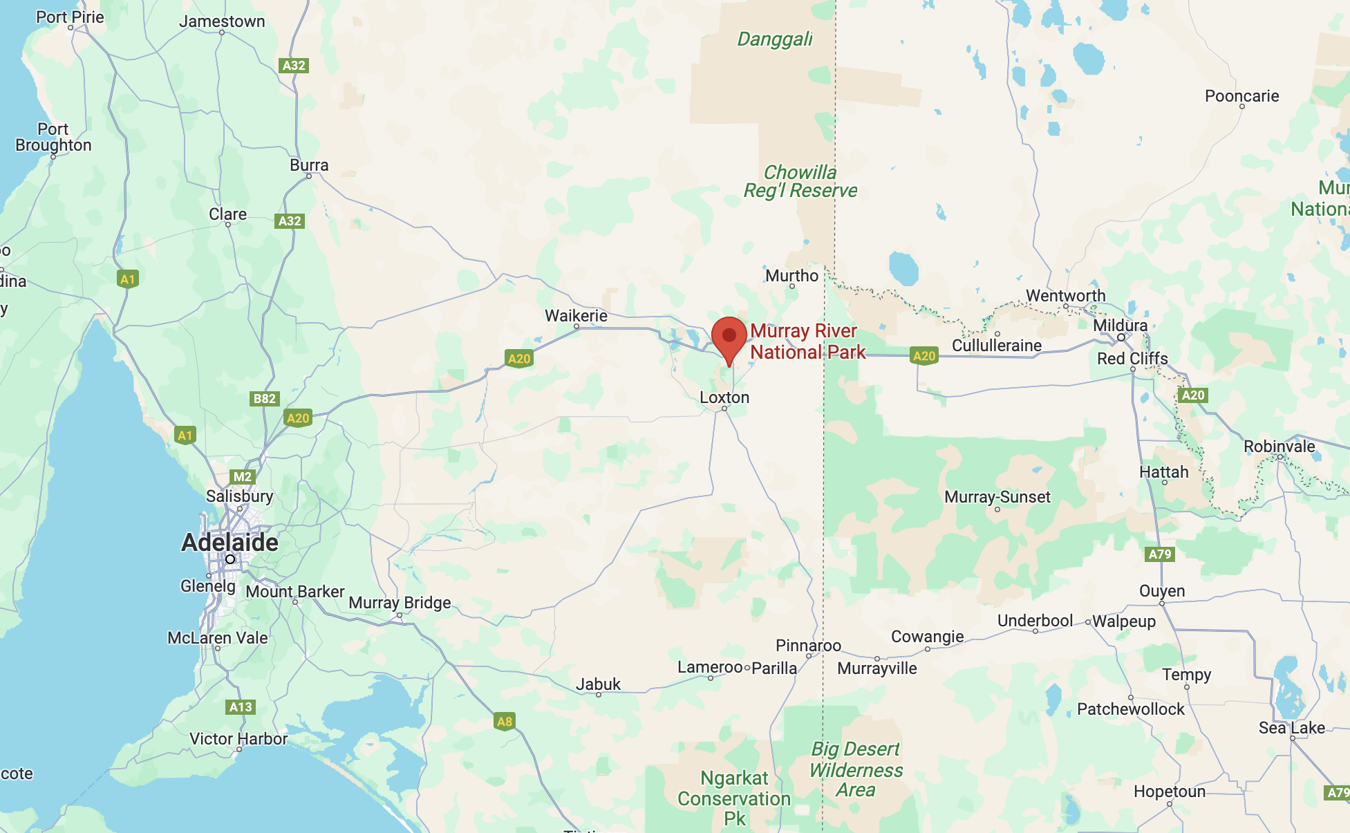 Above:- Map showing the location of the Murray River National Park. Map c/p Google Maps.