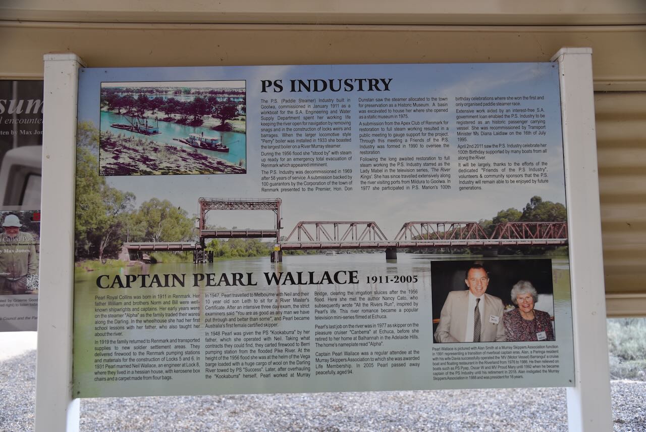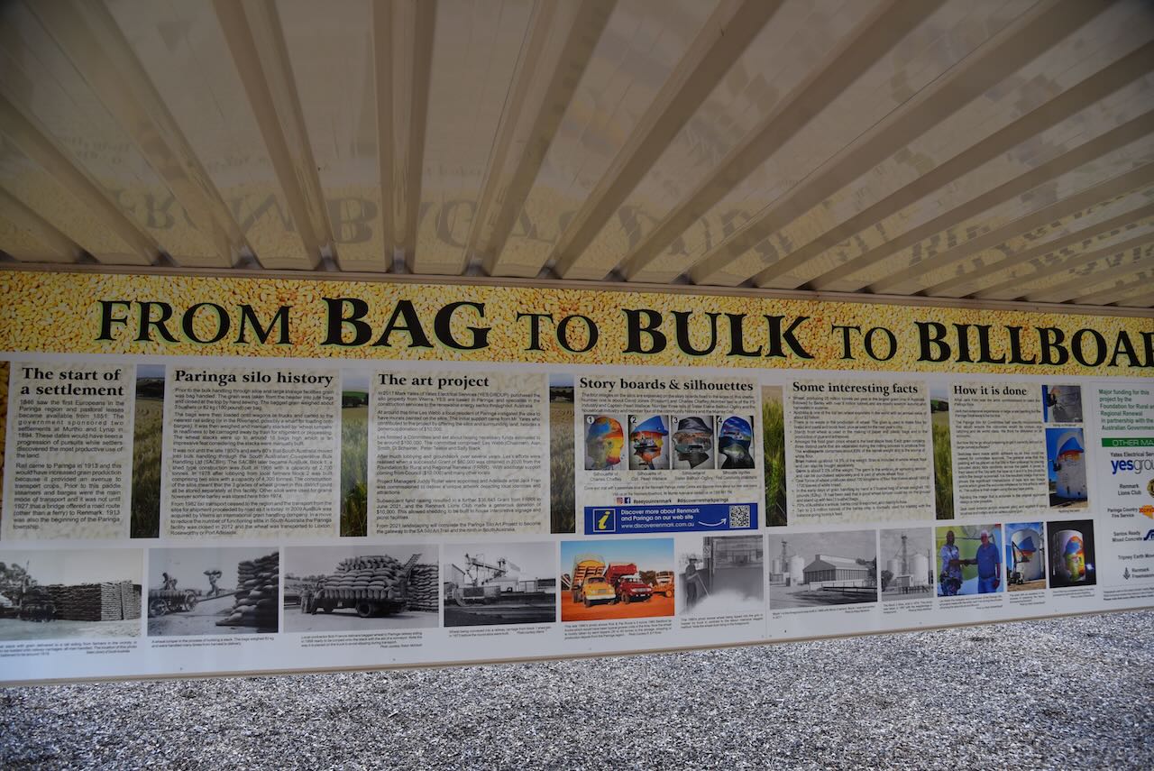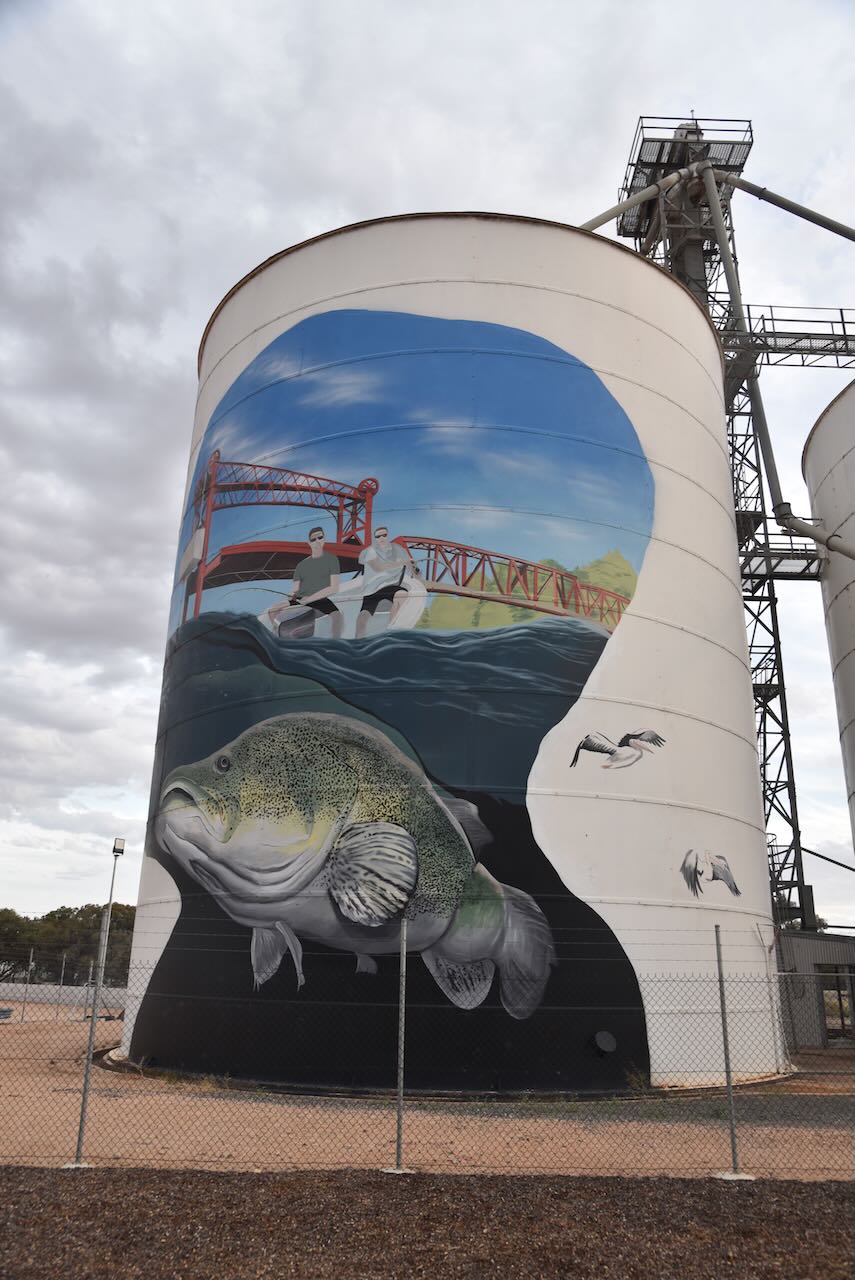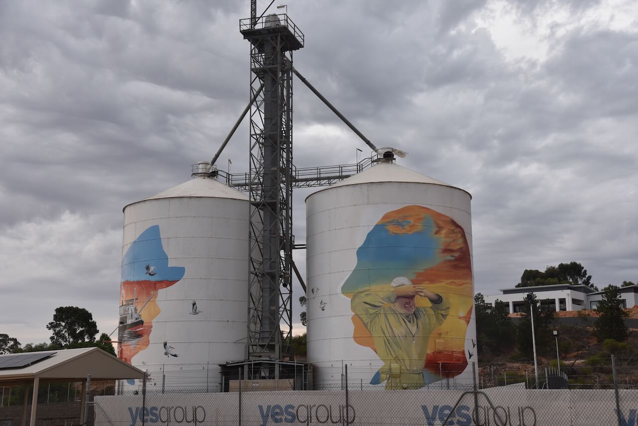 The Paringa silos were painted by Jack Fran and Sam Brooks. The silos feature a silhouette likeness of a local hero to the region. This includes George Disher, Sister Elaine Balfour-Ogilvy, Captain Pearl Wallace, and Charles Francis Chaffey. For more information on the silo have a look at the Australian SIlo Art Trail website.