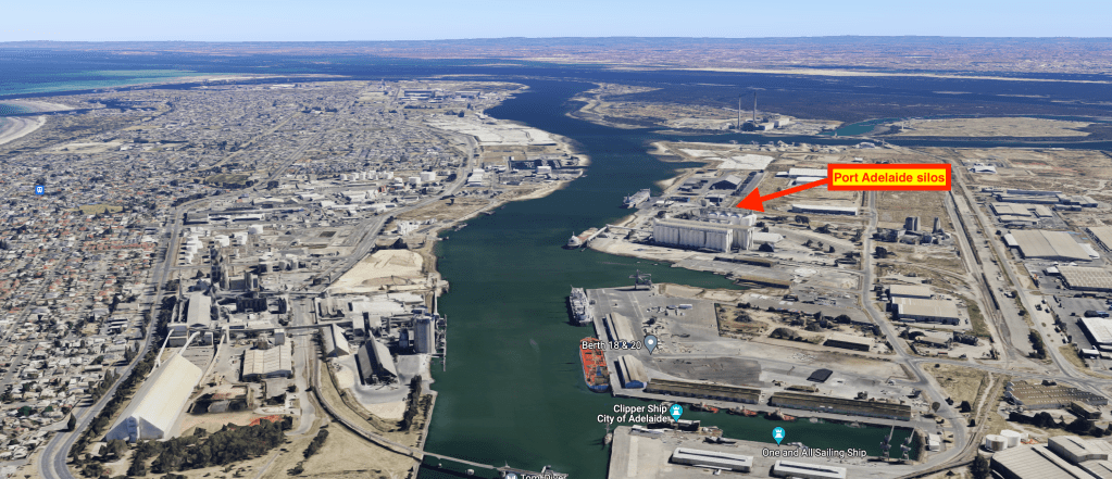 Above:- An aerial view of Port Adelaide showing the location of the silos. Image c/o Google Maps.