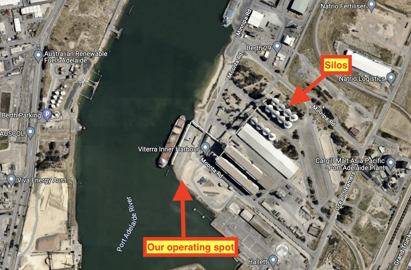 Above:- An aerial view of Port Adelaide showing the location of the silos. Image c/o Google Maps.