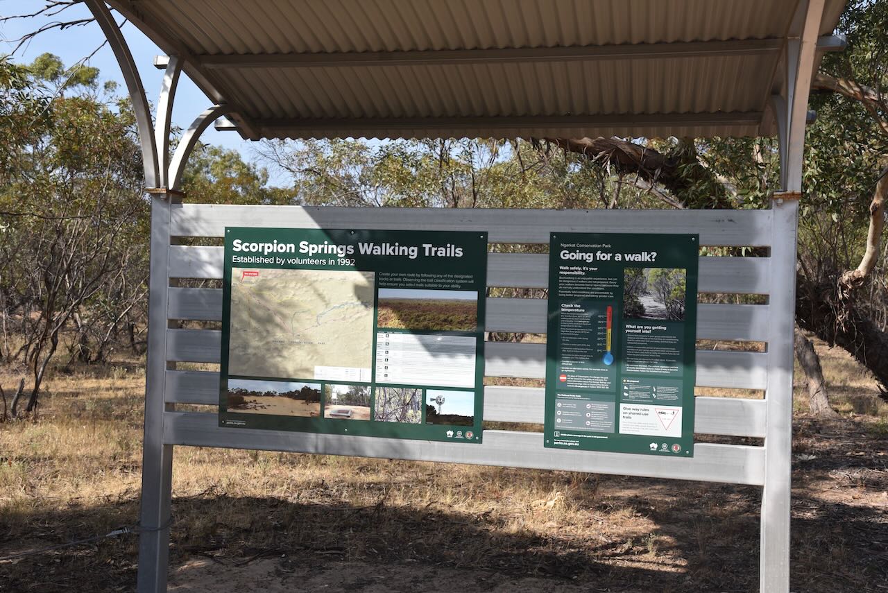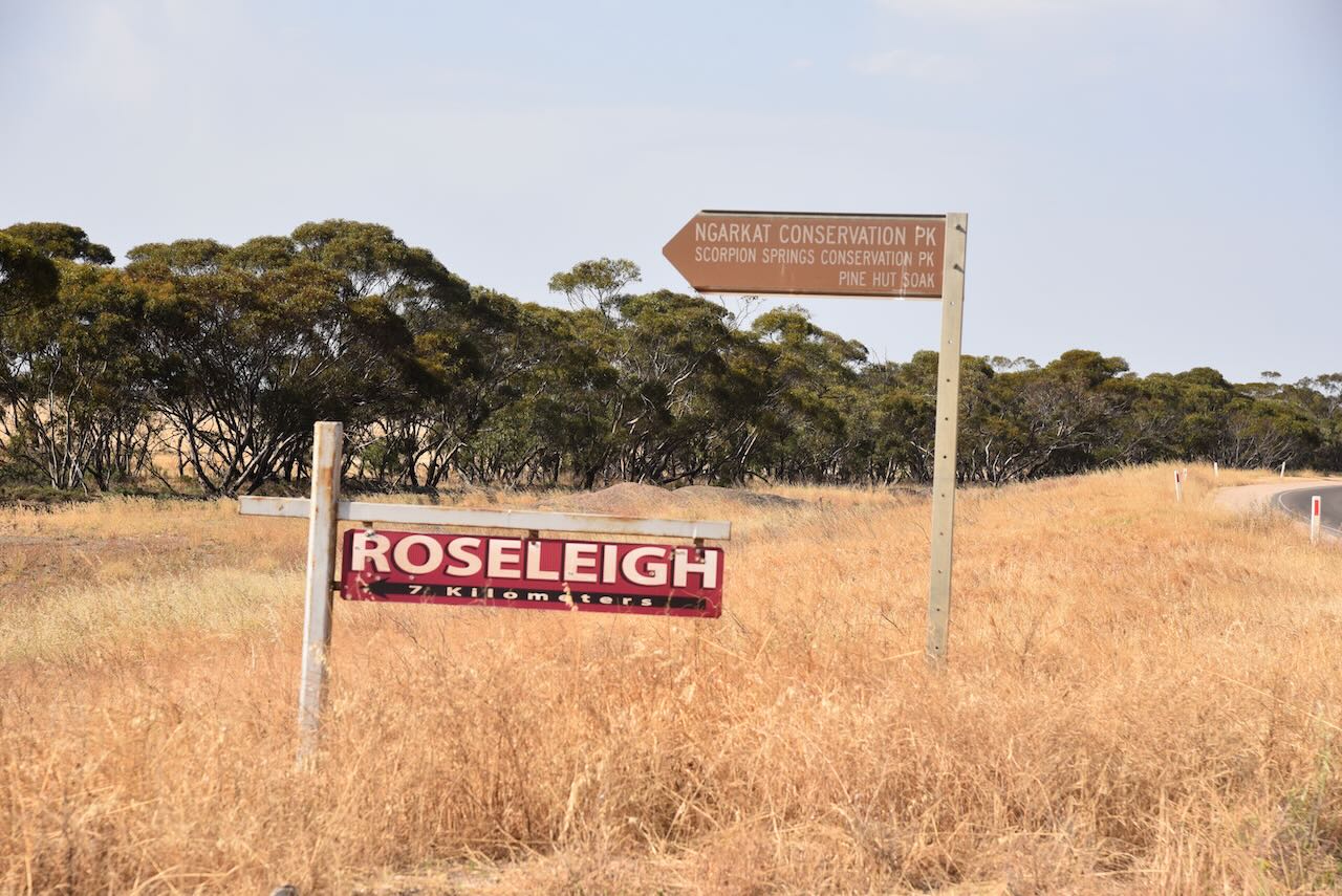 The turn off the Mallee Highway onto Rosy Pine Road to the park is well signposted, although inaccurate as it records Scorpion Springs Conservation Park (see below).