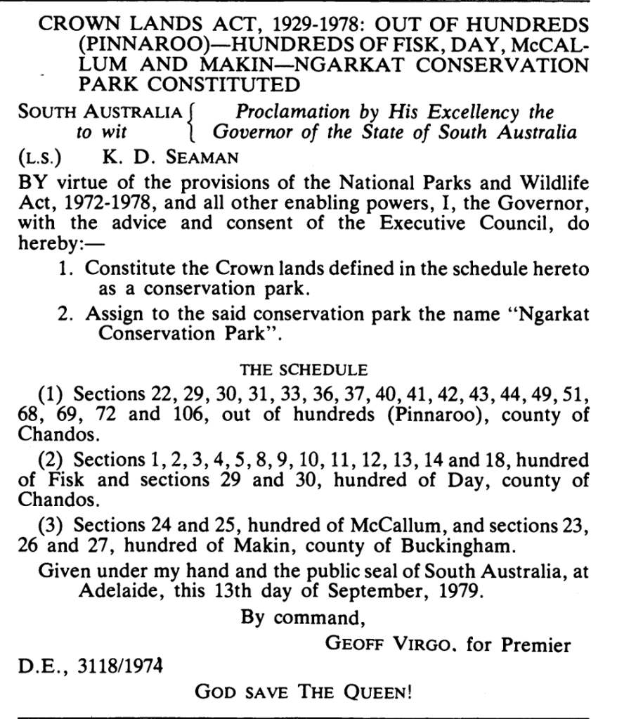Above:- The gazettal of the park in the SA Gazette, Sep 13 1979. Image c/o Wikipedia.
