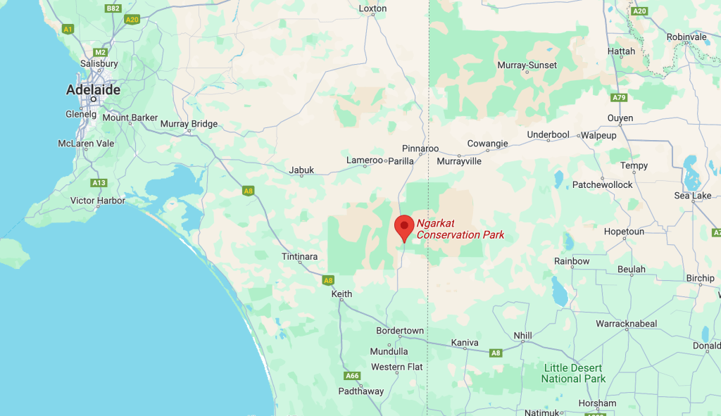 Above:- Map showing the location of the Ngarkat Conservation Park. Map c/o Google Maps.