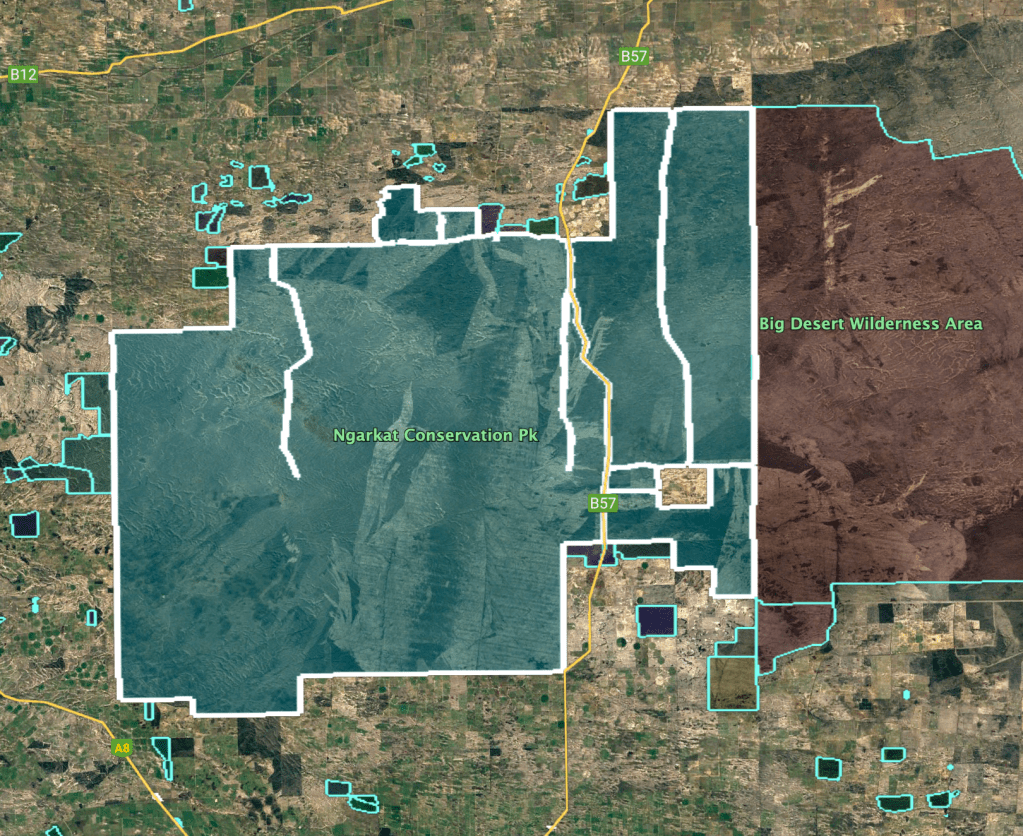 The eastern boundary of Ngarkat Conservation Park adjoins the Victorian State border and Big Desert Wilderness Area.