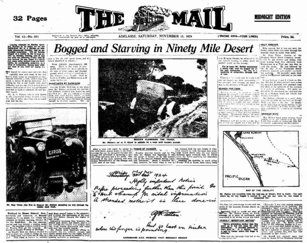 Prior to this, the area had been very remote and dangerous. This is highlighted in the article below which relates to Mr. A.J. Ratten who became bogged in the Ninety Mile Desert in 1924. The article states: