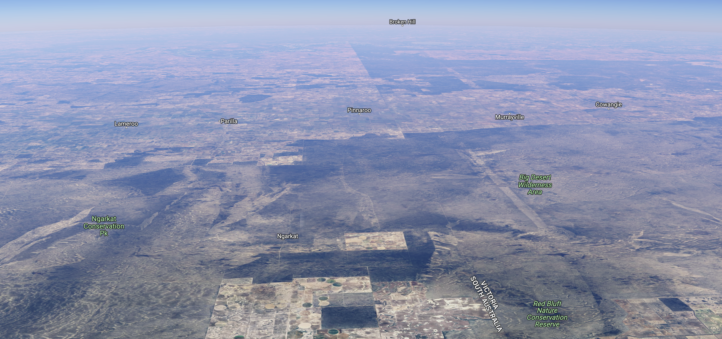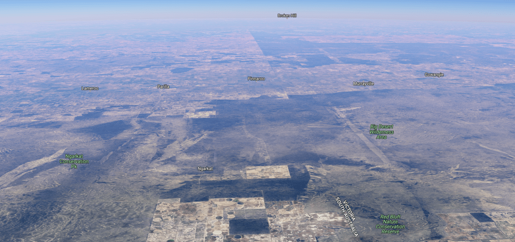 Above:- The Ngarkat Conservation Park, bordering the Victorian State border. Image c/o Google Earth.