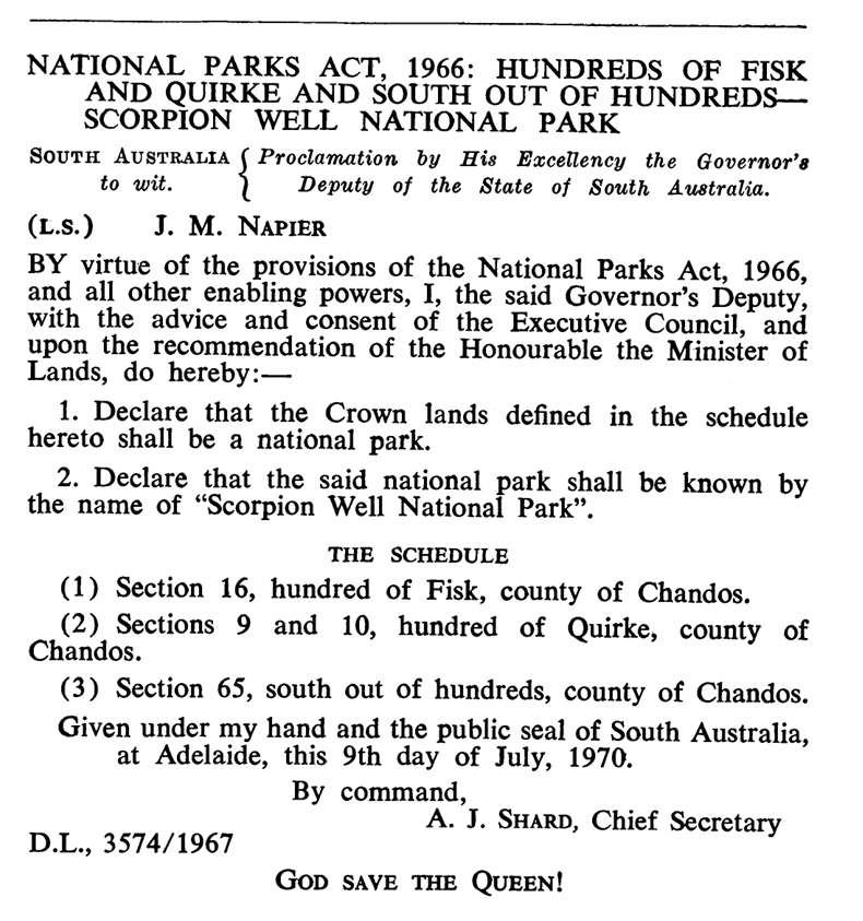Above:- Declaration of Scorpion Well National Park, SA Govt Gazette, 9 July 1970.