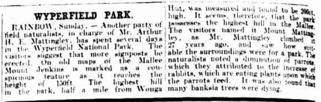 Mattingley continued to visit the Wyperfeld National Park, often leading parties of field naturalists.
