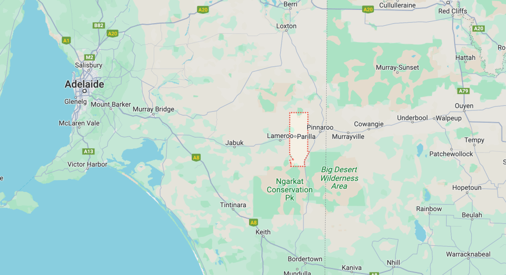 Parilla is about 214 km east of the city of Adelaide and about 14 km east of the town of Lameroo.