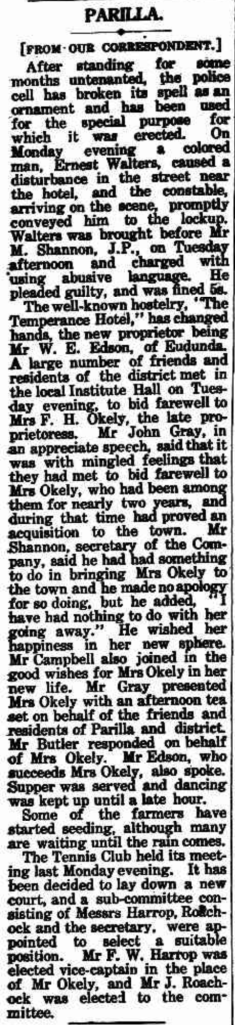 Just one year after being proclaimed a town, the Parilla Hotel opened in 1908. Parilla also had an old gaol, which was opened in 1911. It was located where the current playground is now situated. Parilla once had a hotel, general store, temperance hotel, public hall, school, baker shop, blacksmith shop, butcher, slaughterhouse, gaol, station master’s house, churches, a football club, and a tennis club. (Mallee Tracks 2003)