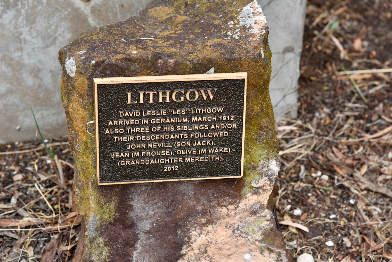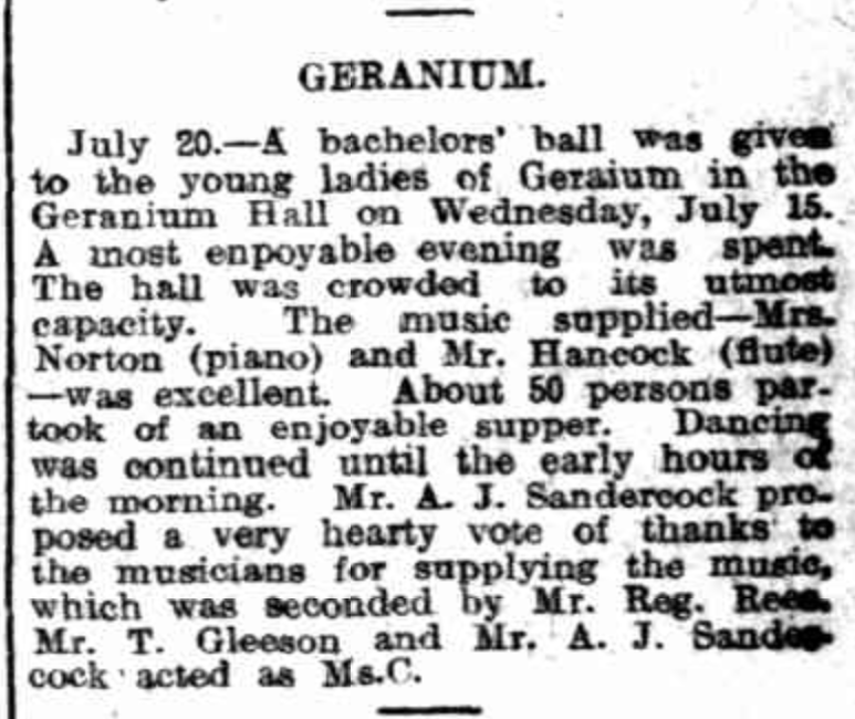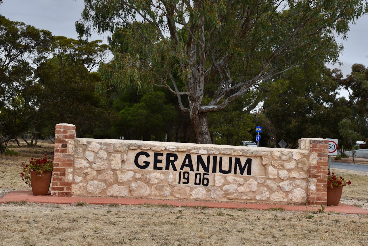 The town of Geranium was proclaimed on the 24th day of March 1910 and takes its name from the native plant, Pelargonium australe “Geranium. The plant once grew profusely in the district, however, it is rarely found today due to the clearing of the land for agricultural pursuits. ; it is rarely seen today due to the cultivation of the land. Children once called the plant “knives and forks” due to its unusual seed pod which was three inches long and very pointed. (Manning 2012)