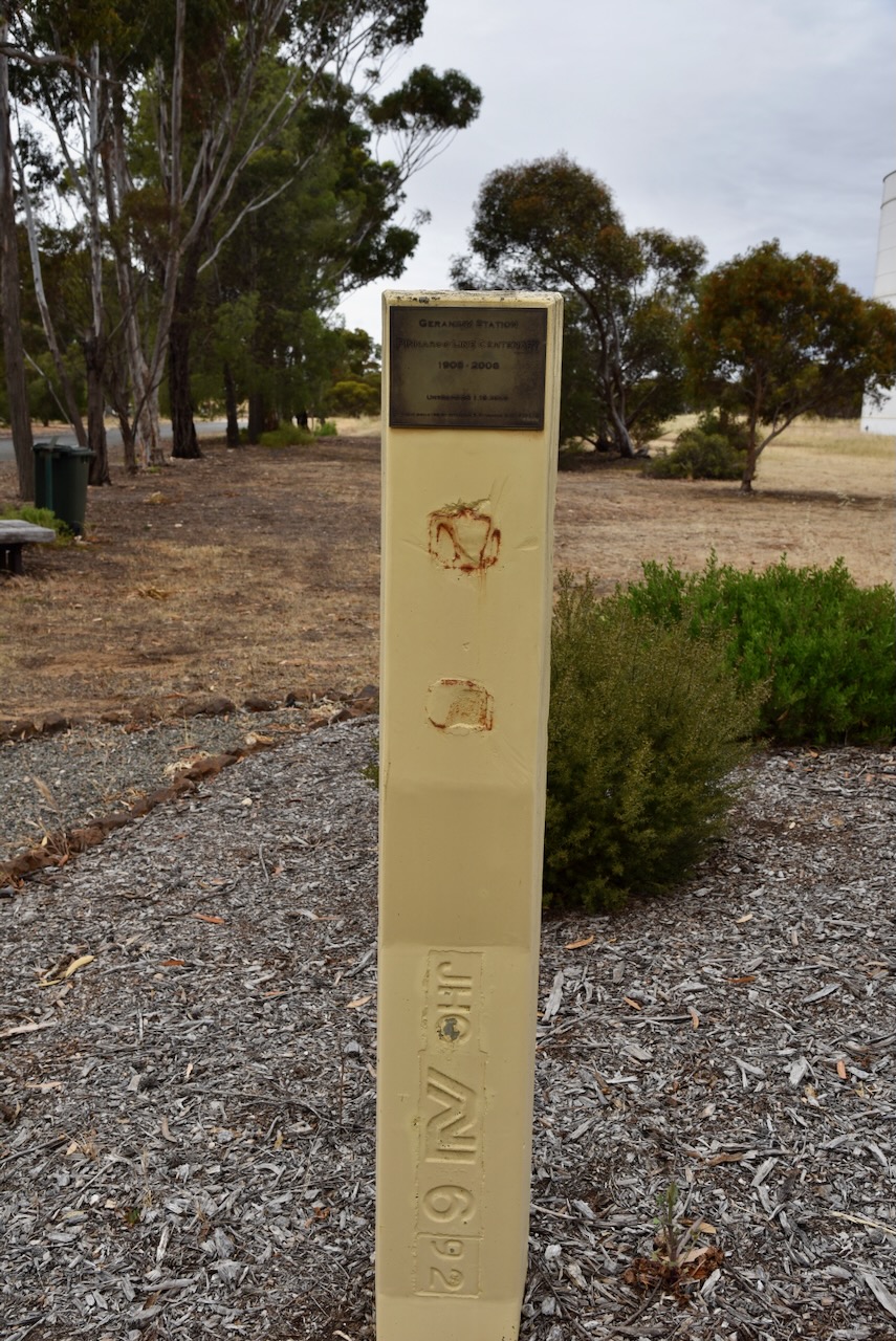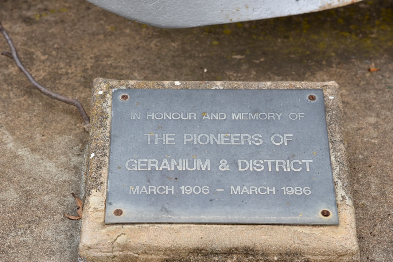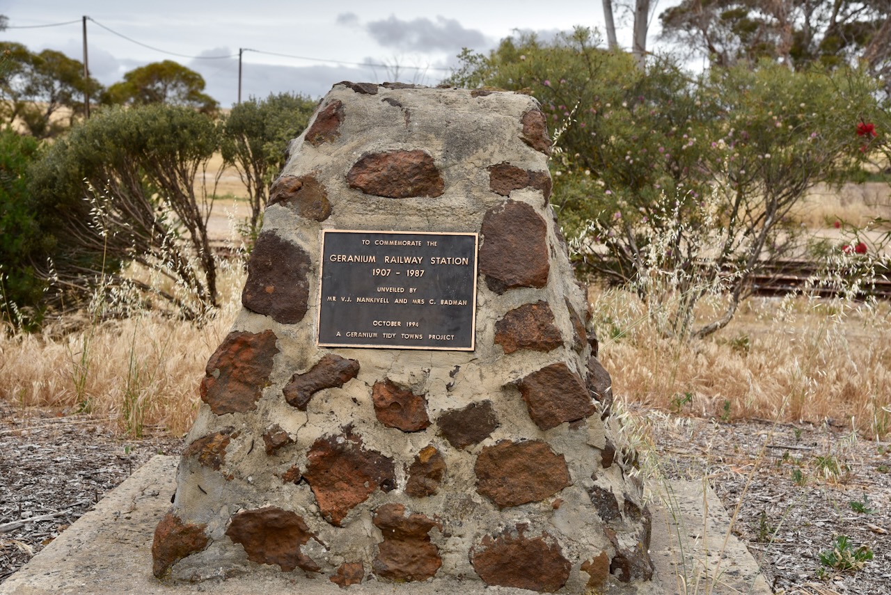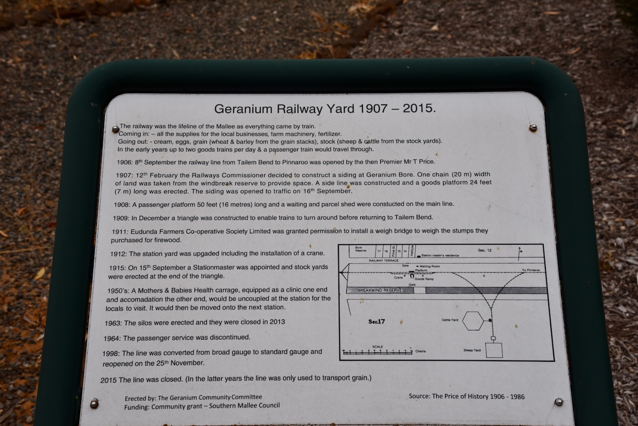 Alongside the silos are some interesting monuments and information boards about the old Geranium railway yards. Geranium was on the Pinaroo line and had a railway station which was operational from 1907 until 1987. The railway was the lifeline of the town with cream, eggs, grain (wheat & barley), stock (sheep & cattle) going out, and supplies for local business, farm machinery and fertilizer coming in. In its heyday, up to two goods trains per day and a passenger train would travel through Geranium.