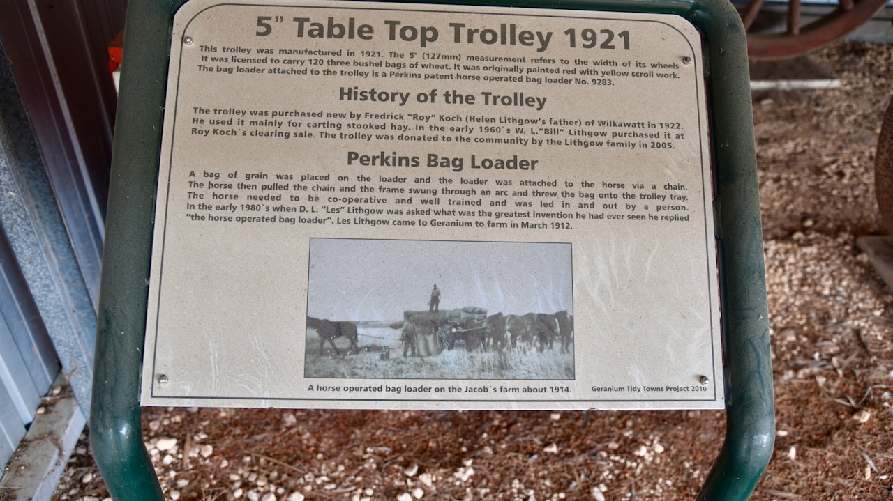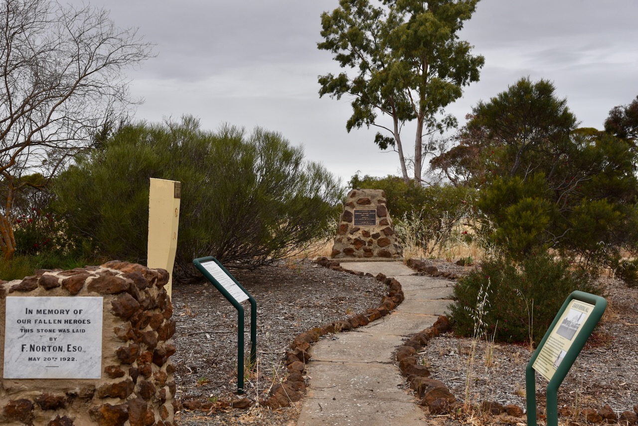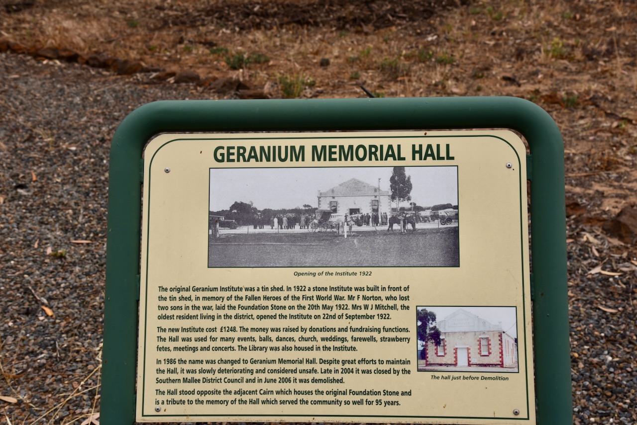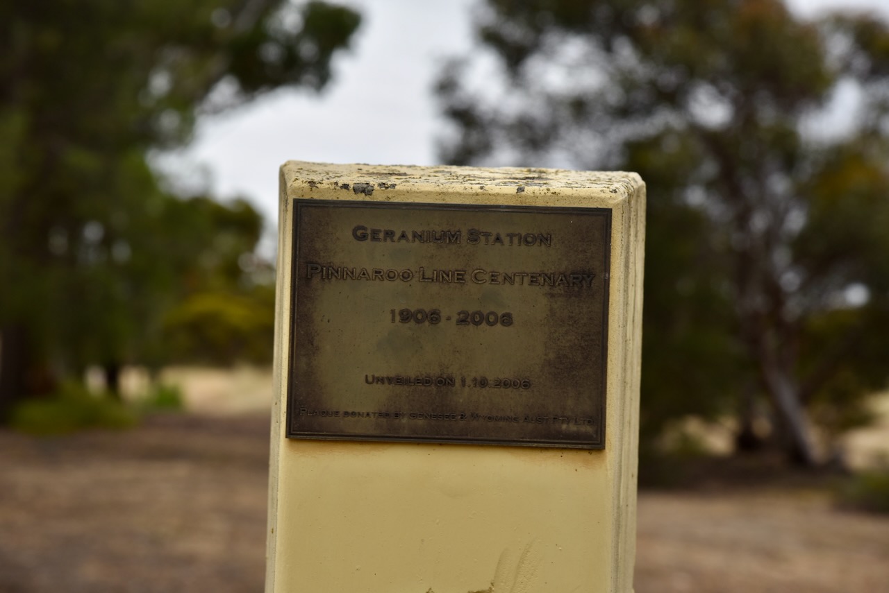 Alongside the silos are some interesting monuments and information boards about the old Geranium railway yards. Geranium was on the Pinaroo line and had a railway station which was operational from 1907 until 1987. The railway was the lifeline of the town with cream, eggs, grain (wheat & barley), stock (sheep & cattle) going out, and supplies for local business, farm machinery and fertilizer coming in. In its heyday, up to two goods trains per day and a passenger train would travel through Geranium.
