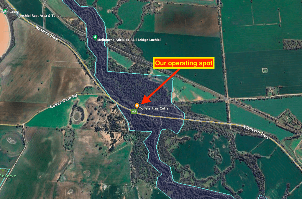 We operated from the rest area on the Western Highway where the Wimmera River crosses the Highway northwest of the town of Dimboola.