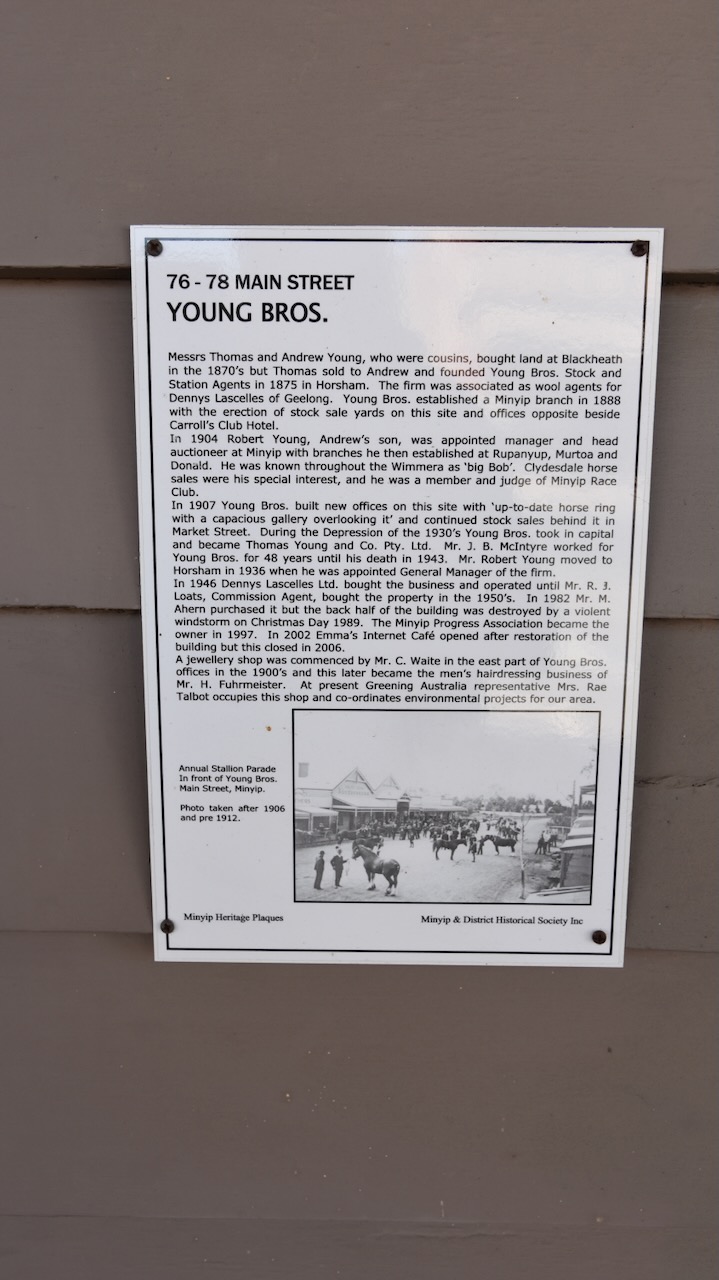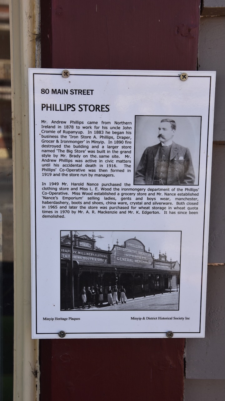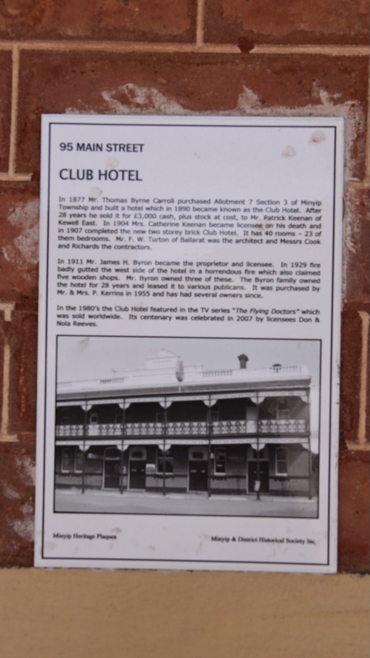 Minyip is a town rich in history. There are numerous historic buildings and there is a heritage walk which can be undertaken. Many of the buildings have information boards describing the history of the building.