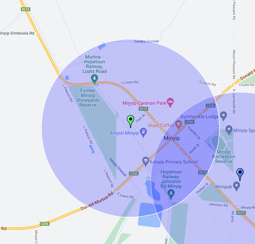 There are two silos in the Minyip. Minyip VK-MNP3 which are located on Mill Street, and the Wimpak silos VK-WMK3 which are located on R. Learmont Road.
