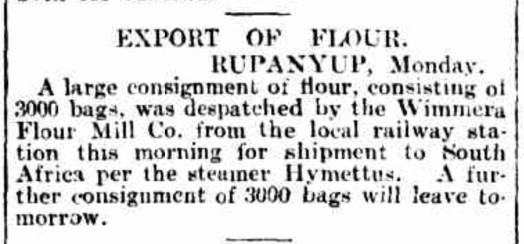 The silos had a capacity of 145,000 bushels. In 1920 the silos were taken over by R. Brunton and Co. In 1925 it was reported that the Rupanyup silos employed 20 men constantly and 40 during the height of the wheat season. The mill handled 120,000 bags of wheat each year, of which 85,000 bags were delivered by farmer’s teams. (Trove 2024)