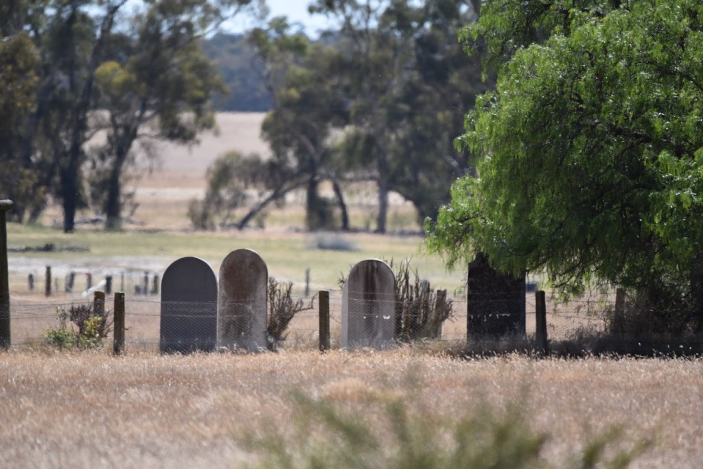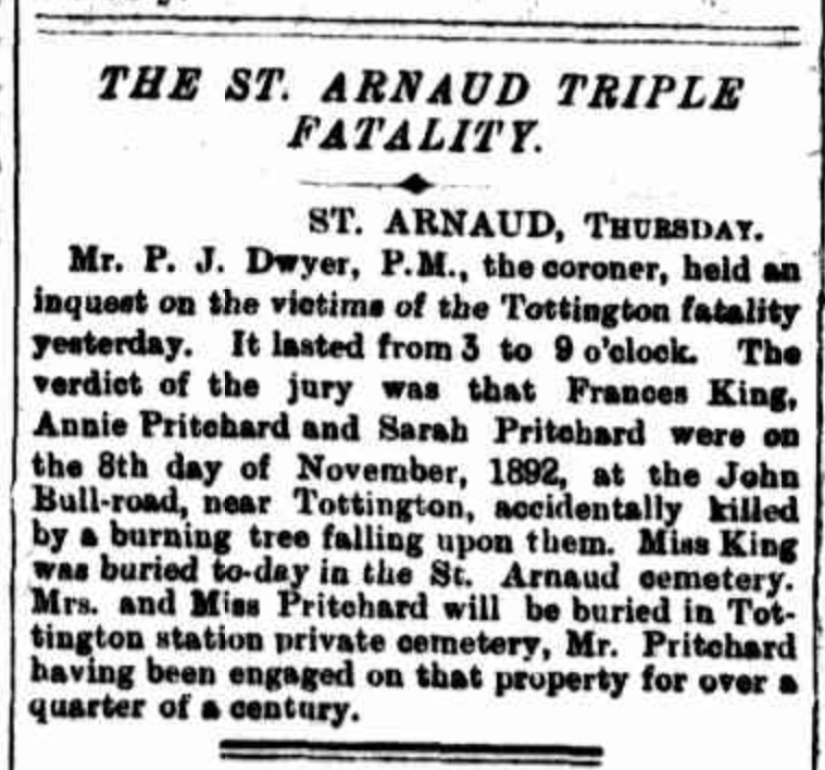 One of the headstones is for Sarah Pritchard aged 57 years and her daughter Annie aged 21 years. In November 1892 they were driving home from a dance in a double-seater buggy and passed a burning tree that fell and crushed them both. Also killed was Frances King. (Trove 2024)