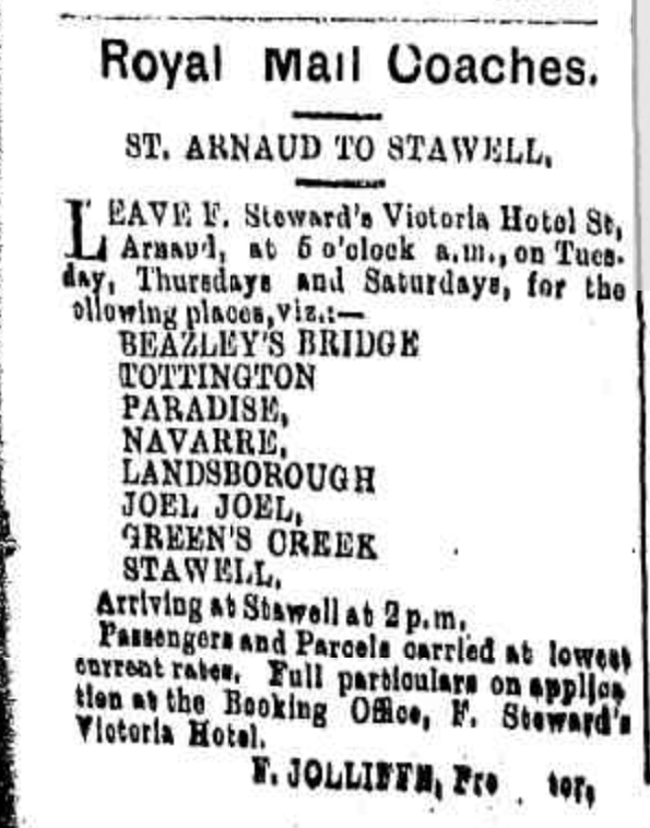 Royal Mail Coaches once ran from St Arnaud to Stawell, stopping at Beazleys Bridge and Tottington.
