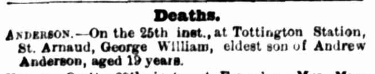 Another headstone is for 19-year-old George William Anderson who died in 1881. Anderson and his brother were driving cattle and during a thunderstorm, they sheltered underneath a tree. The cattle broke and the boys galloped after them, their horses colliding head-on, resulting in the death of George.