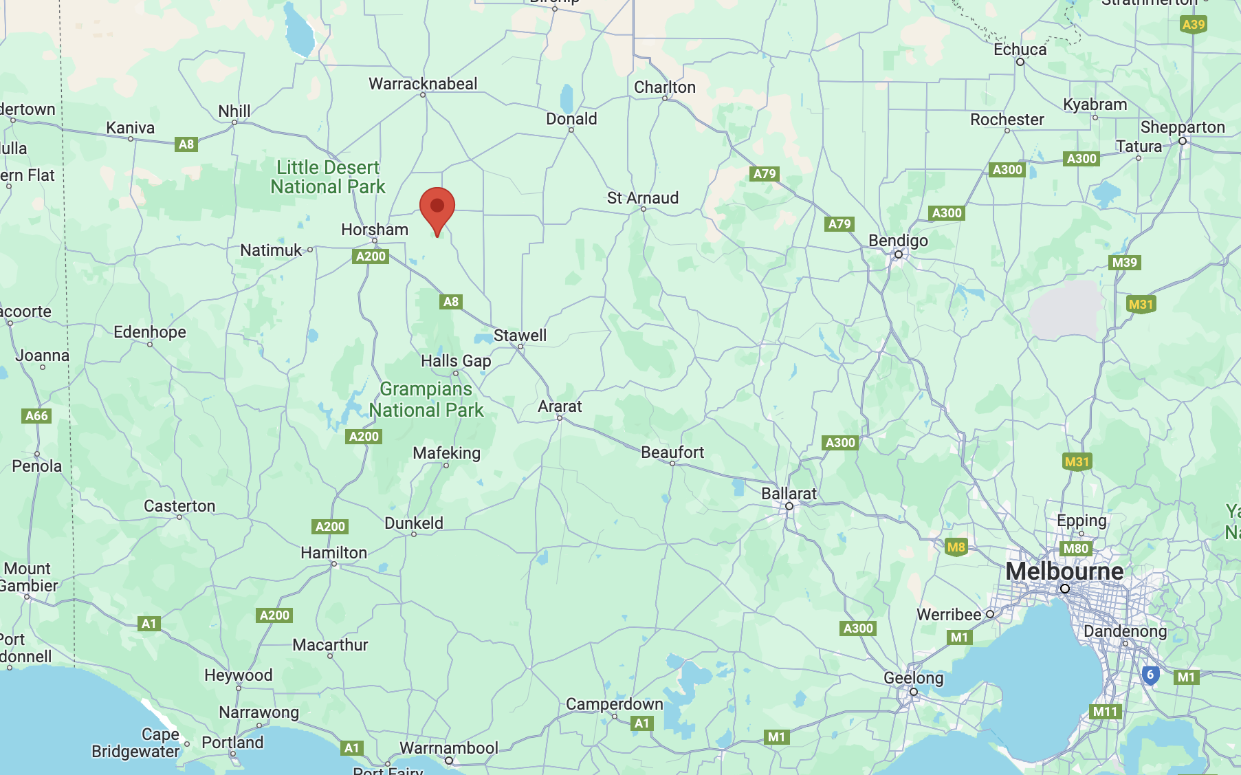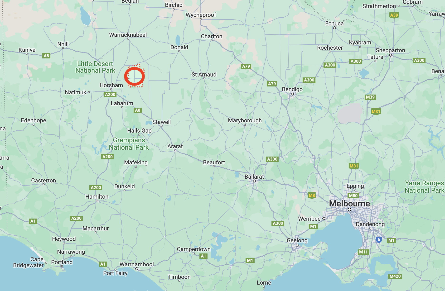Above:- Map showing the location of Murtoa in Victoria. Map c/o Google Maps.