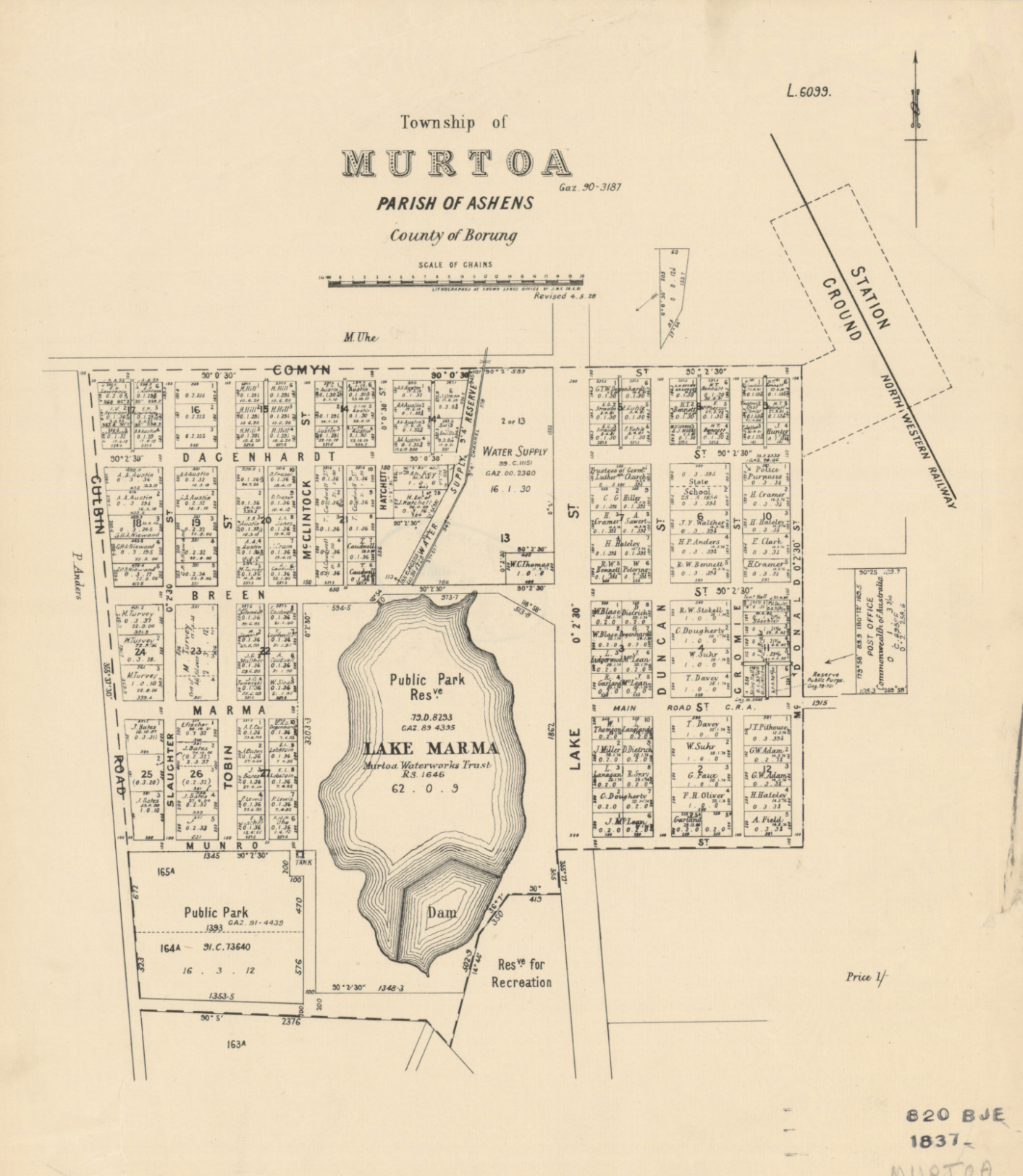 In 1873 the township of Marma Gully was surveyed around the swamp by T.H. Breen. Following its establishment as a town, more settlers came to the area and soon Murtoa was a prosperous grain town. Soon after it was renamed Murtoa by Walter Madden, the Land Officer in Horsham. By 1878 the main Melbourne railway line had reached Murtoa and this increased the prosperity of the town. (Murtoa Museum 2024) (Murtoa Facebook page 2024) (Murtoa Progress Association 2024).