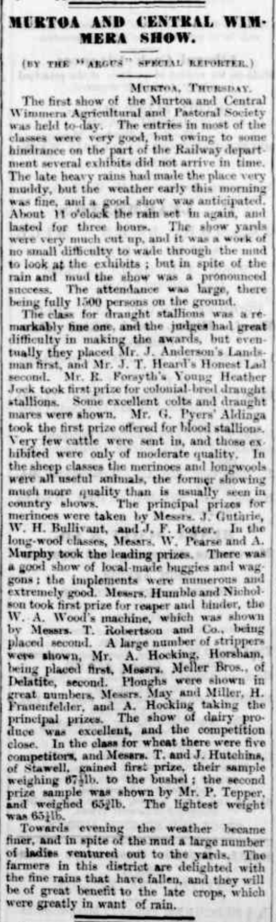 A combined Town Hall, church, and school was built in 1873. The Commercial Hotel was built in 1874. In 1876 a flour mill was opened. In 1877 the Commercial Bank opened a branch at Murtoa. On the 1st day of December 1878, the first edition of the Dunmunkle Standard newspaper was printed. In 1880 the Murtoa Urban Fire Brigade was formed. The following year, 1881, the Murtoa & Central Wimmera Agricultural and Pastoral Society was formed and the first show was held. In 1884 the Murtoa Post Office was opened. Before this mail came via the hotel at Longerong, a farm, and then Anderson’s store in Murtoa. In 1898 the Murtoa Football Club which had been formed about 10 years earlier, won its first premiership. (Murtoa Facebook 2024) (Murtoa Museum 2024)
