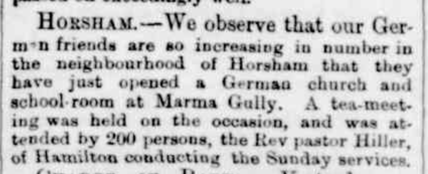 The four men were joined by Hermann Volprecht and they departed Jackie Jackie. They called in on Robert Clark, a store-keeper at Horsham who advised he knew of a boundary rider on Longererong Station called Harry Friend, who was willing to take them to Marma Gully and who had already selected land there. Upon arriving at Marma Gully they found only one house, a shepherd’s hut. They camped alongside Friend’s tent. (Doncaster Hist Society 2024)