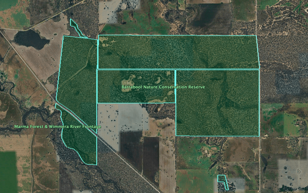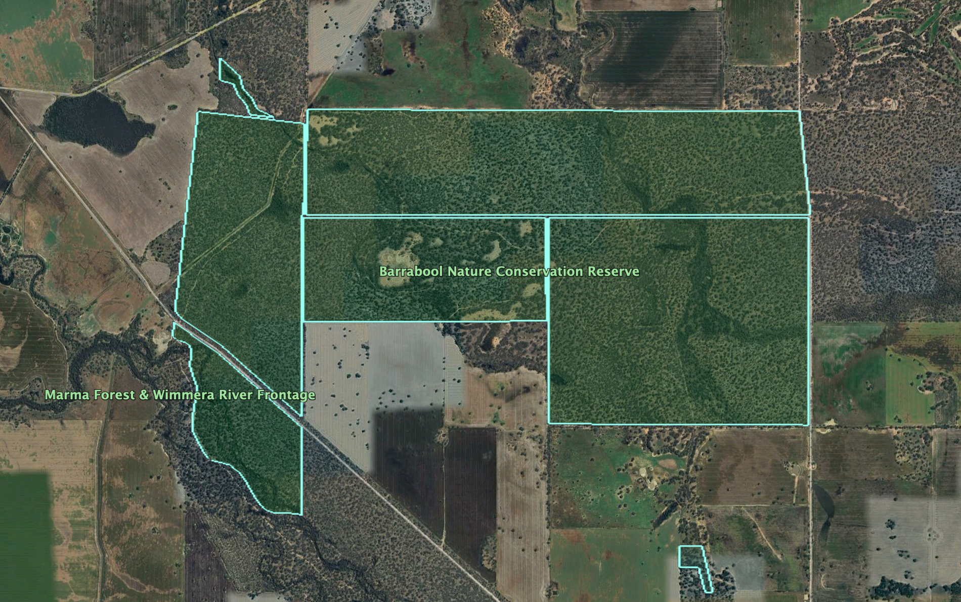 Above:- An aerial view of the Wimmera River Marma Streamside Reserve. Image c/o Google Earth.