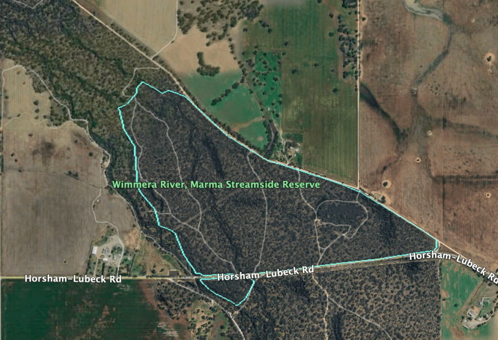 The Wimmera River Marma Streamside Reserve is bordered by Burnt Clay Road to the north, and the Horsham-Lubeck Road to the south.