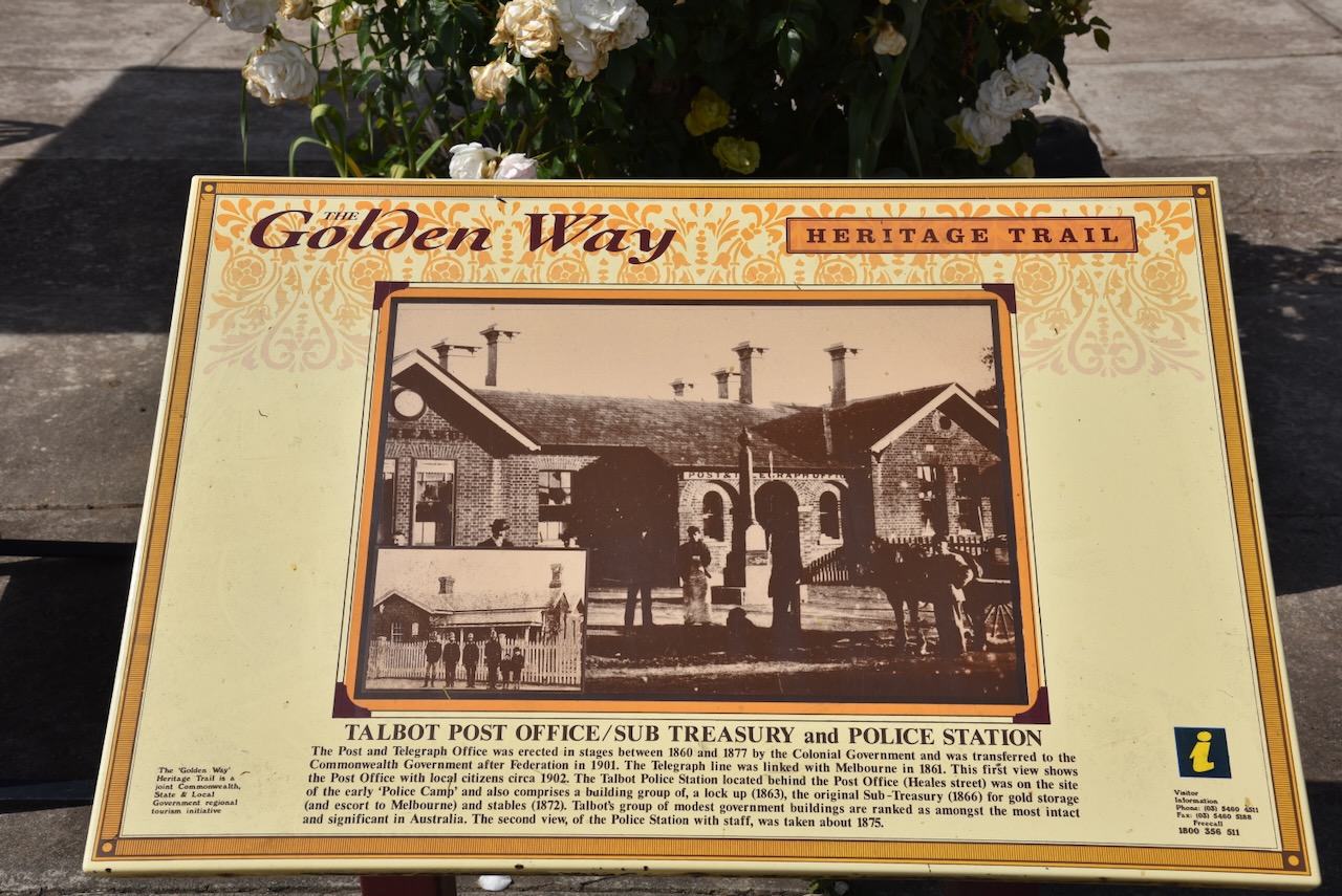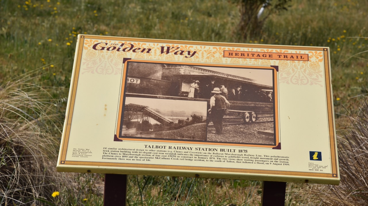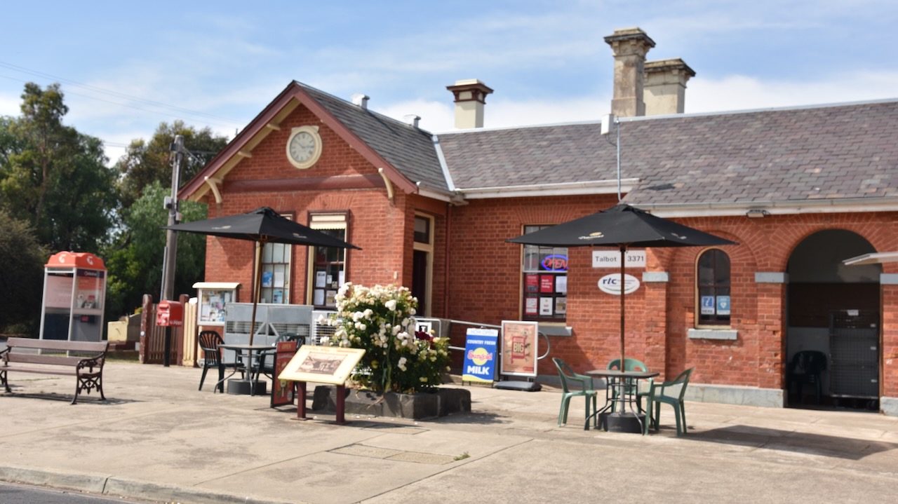 The Talbot railway station was built in 1875. It is of similar architectural design to other railway stations on the Ballarat/Maryborough line such as Clunes and Creswick.