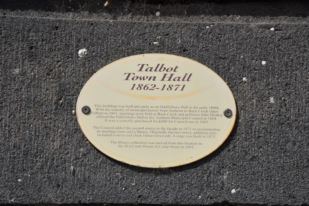 The Talbot Town Hall was originally privately built in the early 1860s as an Oddfellows Hall. In 1864 publican John Medley offered the Oddfellows Hall to the Amherst Municipal Council. In 1865 the Council purchased the building for 600 pounds. In 1871 the Council added the second storey to the facade for its meeting room and library. The second storey originally included a clock and a turret but these have been removed.