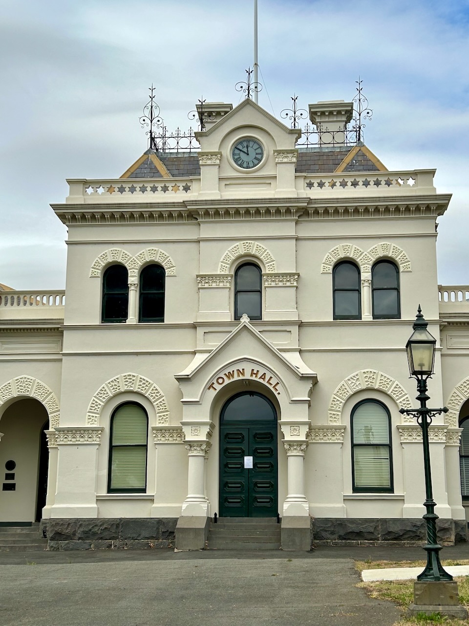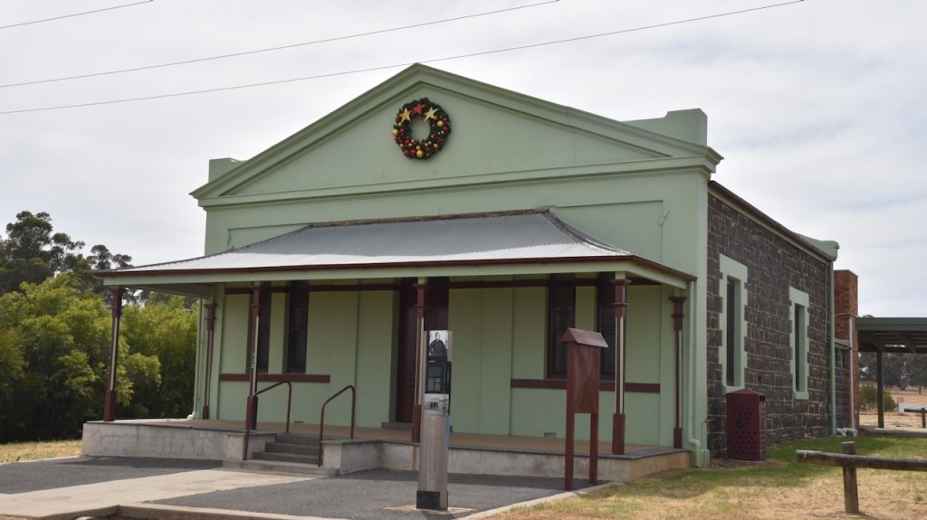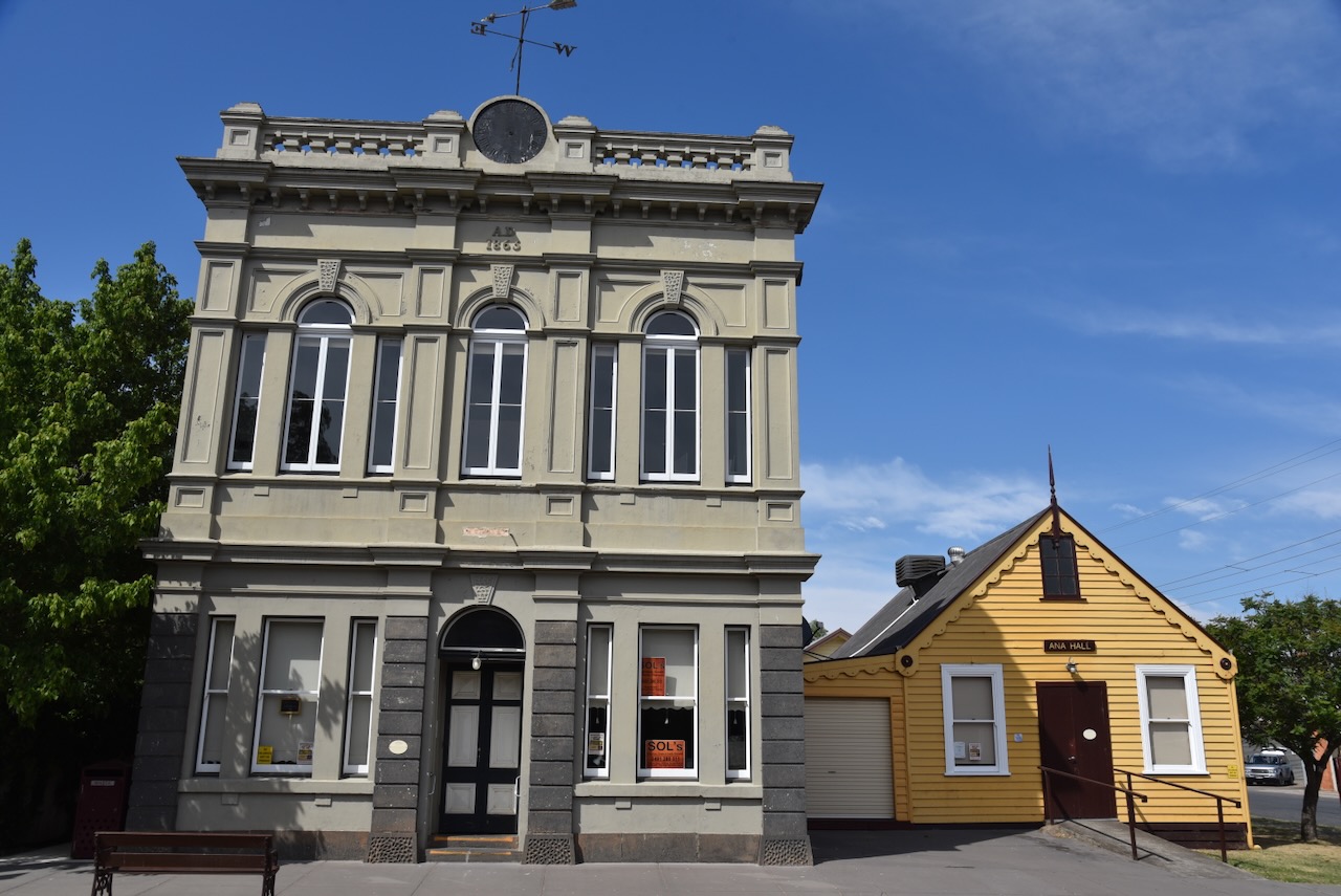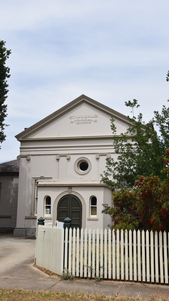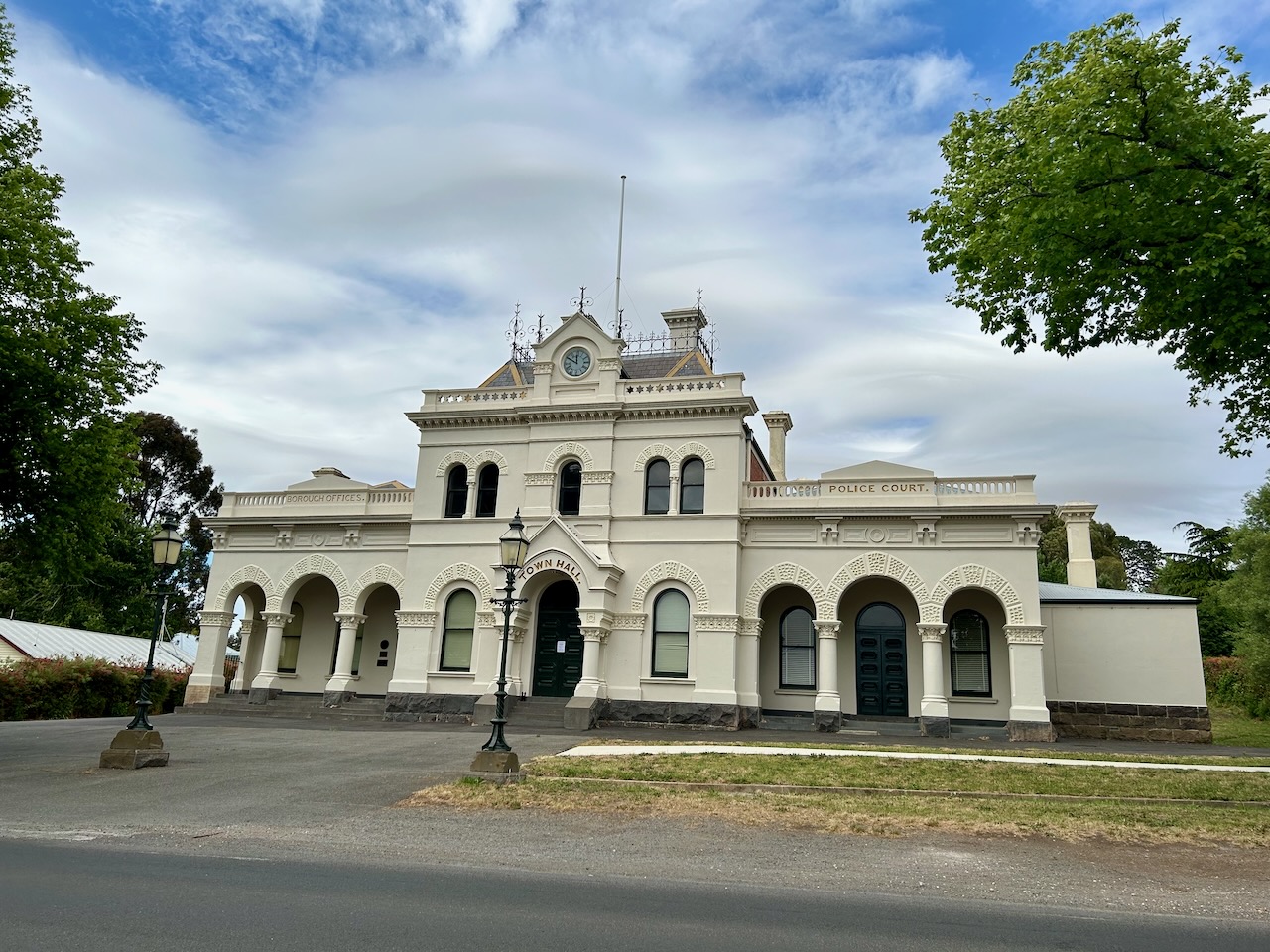 The Majorca Town Hall was built in 1876. The bluestone and render building was severely damaged by fire in 1985 but was restored to its current splendour. (Walking Maps 2024)