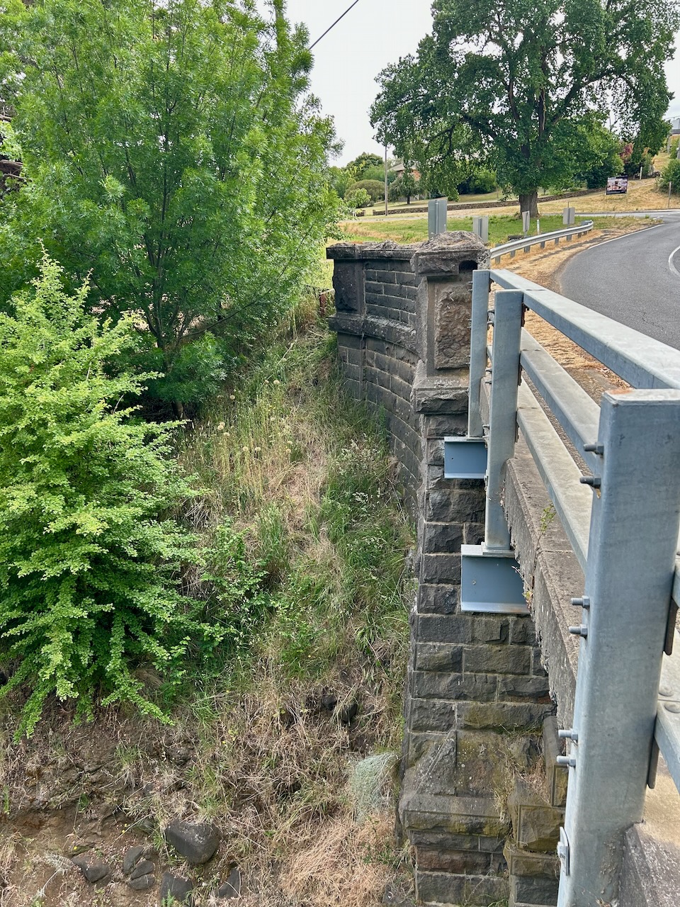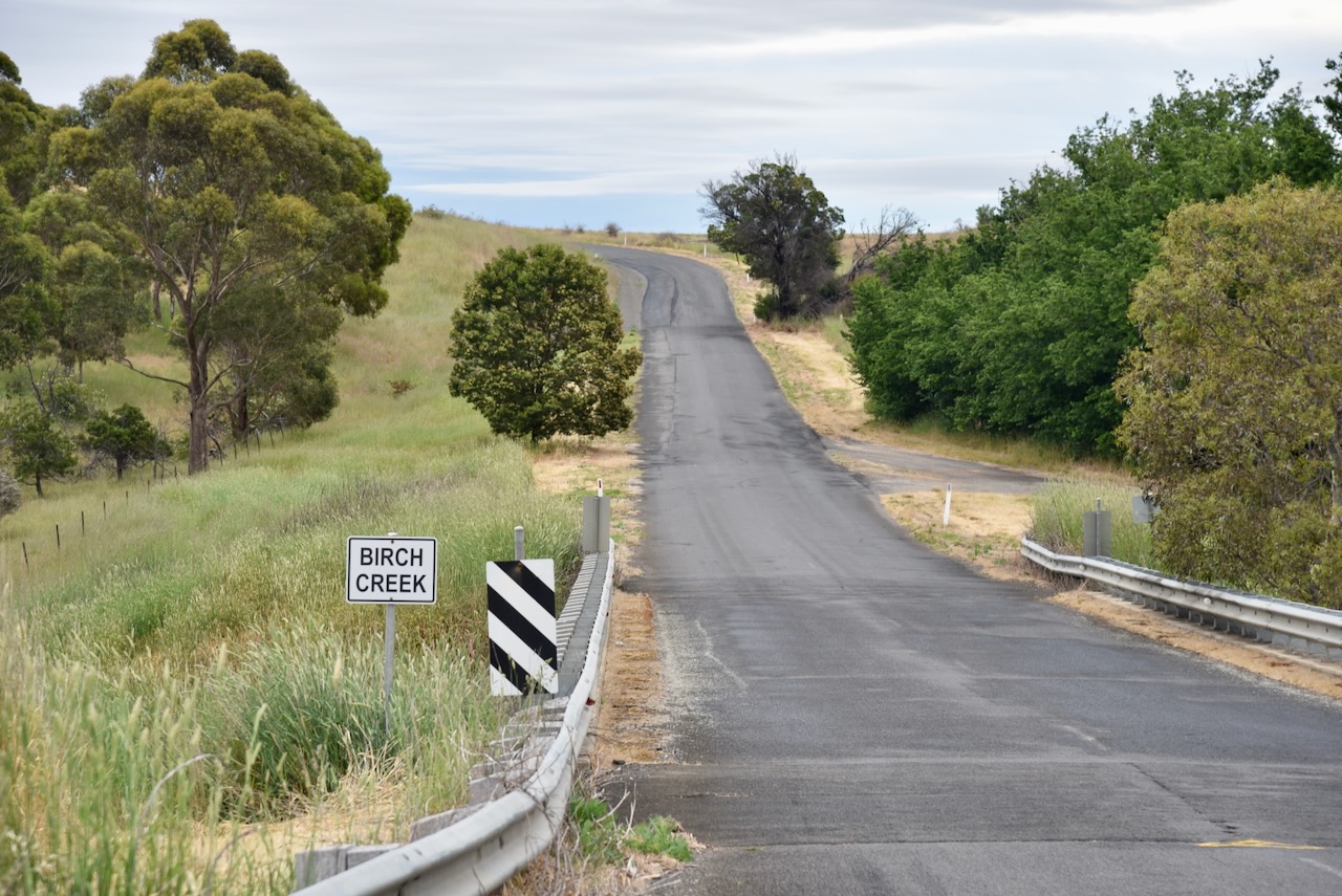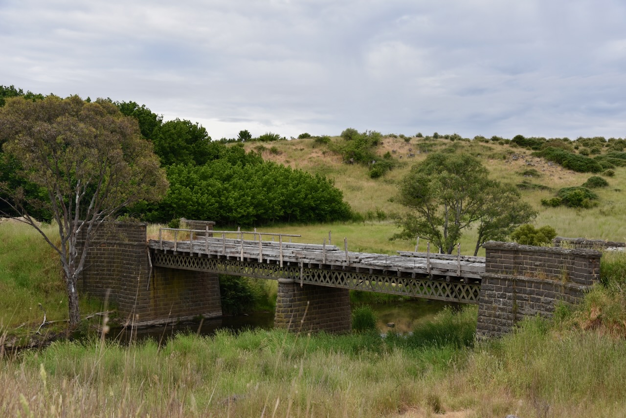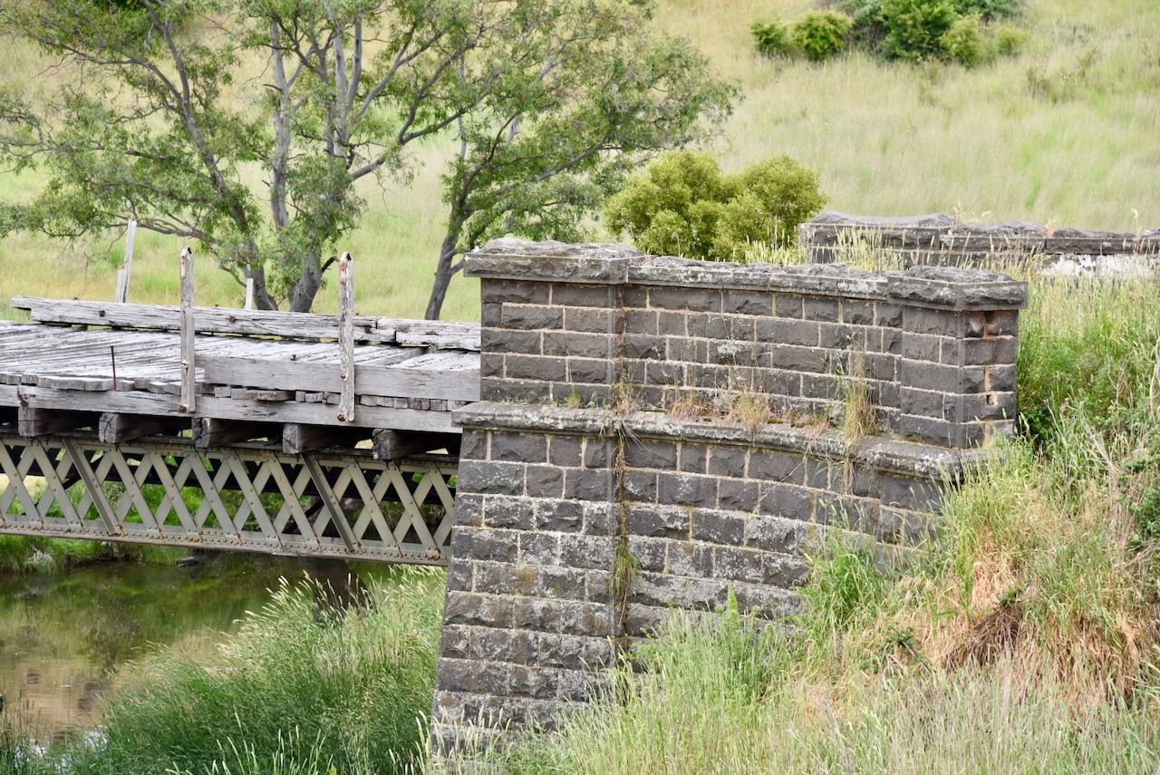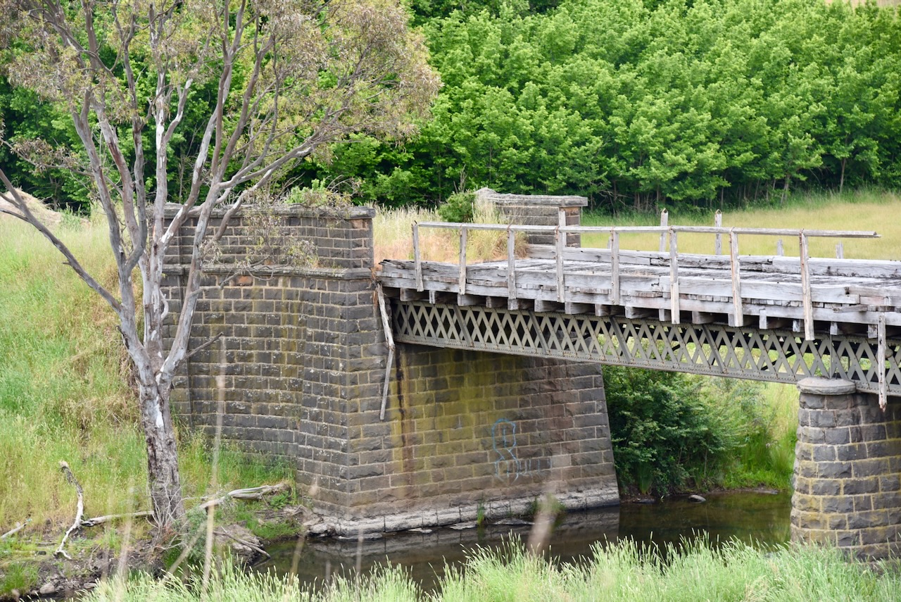 Our first stop of the day was the historic McLennan Bridge over Birch (Bullarook) Creek. The bridge was built in the 1870s, possibly by the Borough of Clunes. It is the third oldest existing Victorian metal truss bridge after the Glemona Bridge at Bung Bong and the nearby Jorgenson’s Bridge. The 14.2 metre span bridge has bluestone abutments and pier, and deck-type lattice trusses. It is one of a small number of riveted wrought iron lattice truss bridges that were built in Victoria to replace early timber bridges that were destroyed in the 1870 floods. (Victoria Heritage Database 2024) (Waymarking 2024)